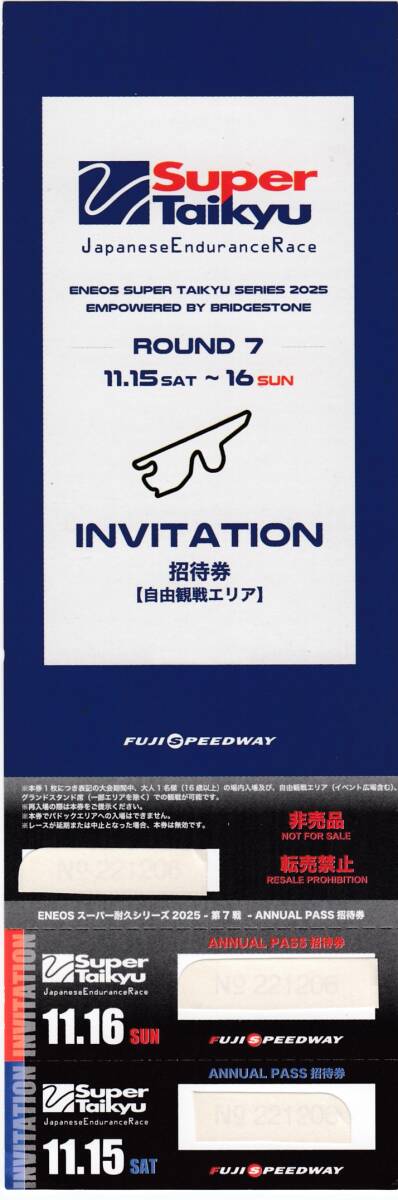 ■ENEOSスーパー耐久シリーズ2025Empowered by BRIDGESTONE第7戦(2025.11.15(土)、2025.11.16(日))富士スピードウェイ開催の2日間有効の観戦チケット(自由観戦エリア)です。