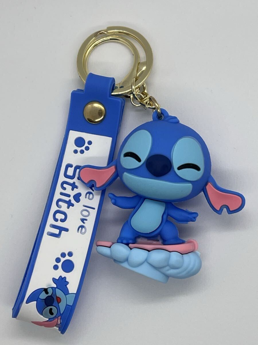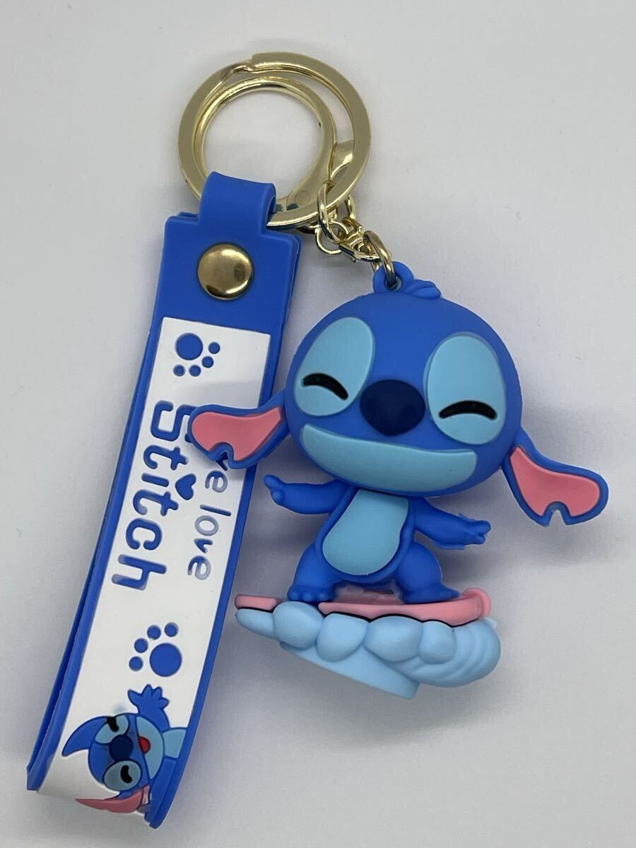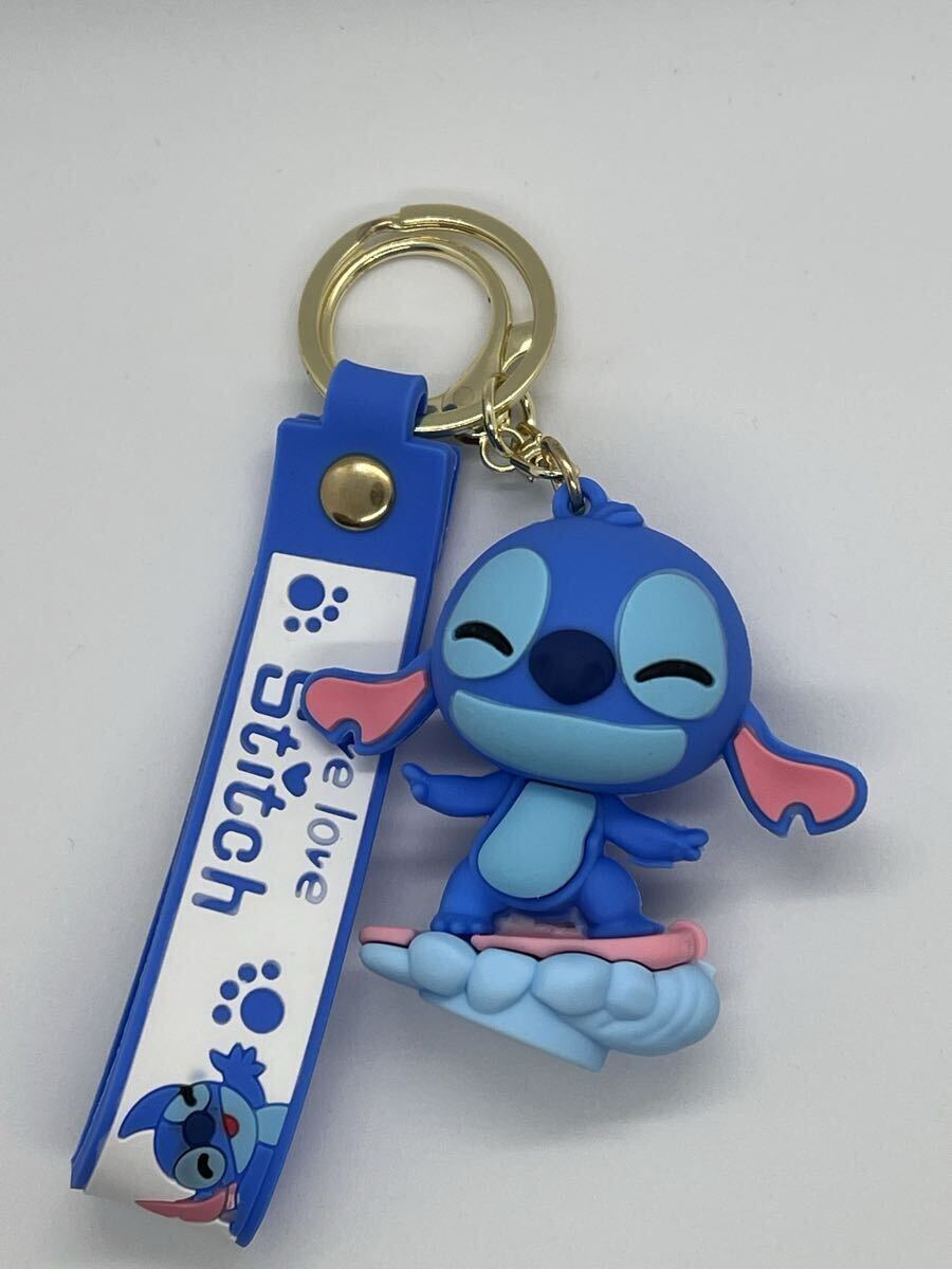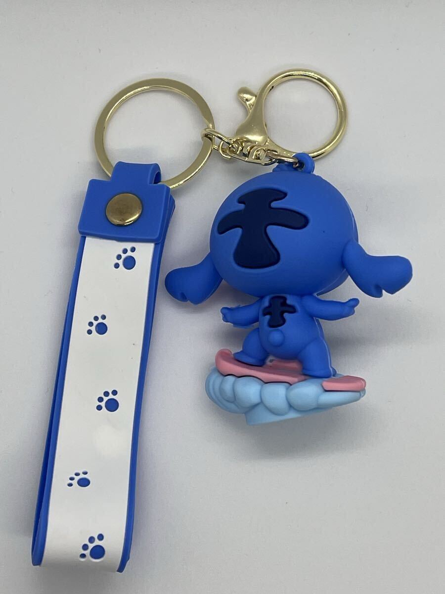 スティッチのフィギュア型キーホルダー、青とピンクの配色が特徴。