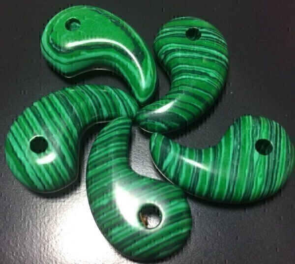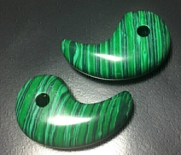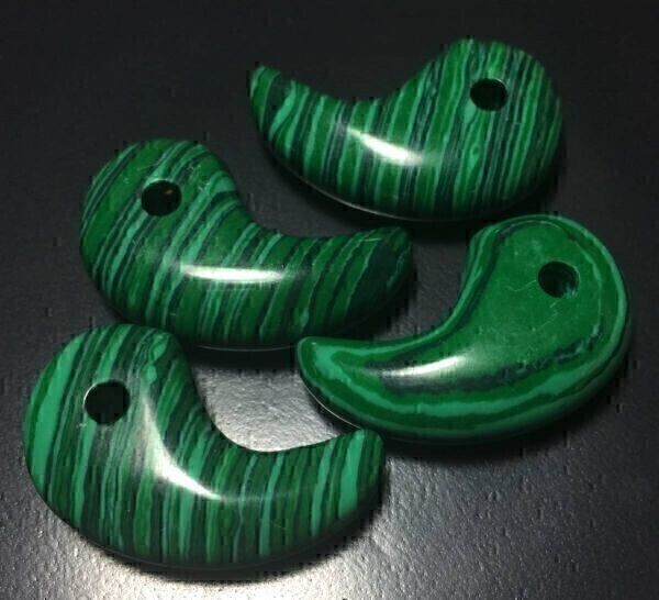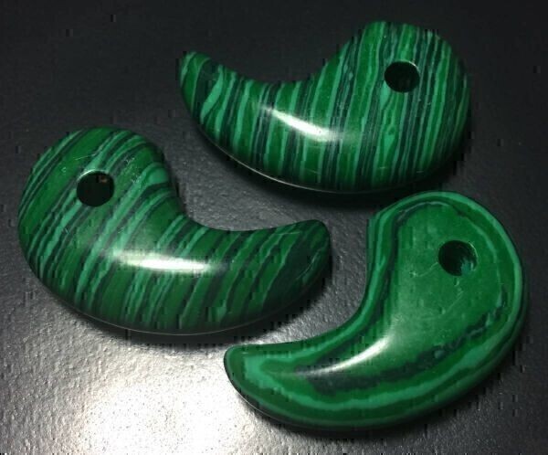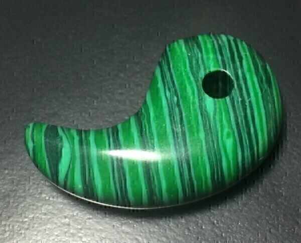 マラカイトは、ストレスや緊張にとても高いヒーリング効果を発揮します。また体力の回復をサポートしながら安眠をもたらす効果があるといわれています。疲れやすいと感じる人は、アクセサリーとして身につけるとよいでしょう。古来より、魔よけのお守りとして親しまれ、危険が迫ると砕けて知らせると もいわれるマラカイトは、邪気をはね返すパワーが強烈です。また勾玉は、日本では遥か縄文時代から神事に用いられていました。勾玉には勾玉には精霊が宿り、それを身に付けるこ とで災厄から身を守ると信じられてきました。マラカイトと勾玉の組み合わせは、とても優しいパワーで、貴方の日常を守り、災厄を遠ざけてくれることでしょう。1個のオークションです。長さは約30ミリです。天然石なので様々な表情があることを写真でご理解下さい。