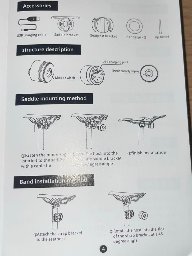 付属品:テールライト本体、説明書、ゴムバンド(大、小)、シートポスト用マウント、マウント取り付け用ガスケット、サイドレール用マウント、インシュロック4本、充電ケーブル(Type-C)