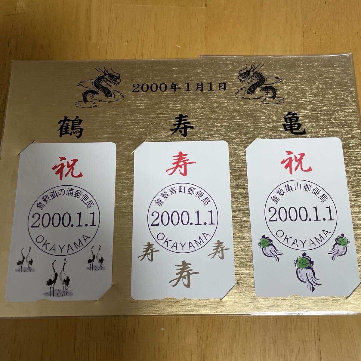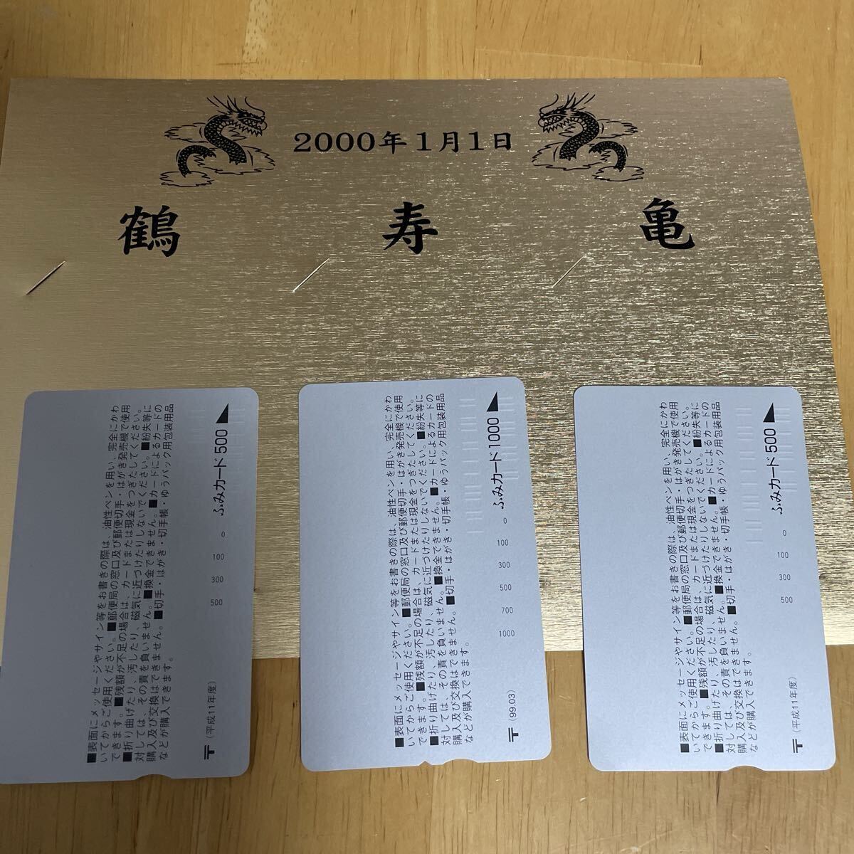 平成11年度・2000年1月1日ふみカード3枚セット。(岡山倉敷・鶴の浦郵便局・寿町郵便局・亀山郵便局)額面合計2000円。未使用。