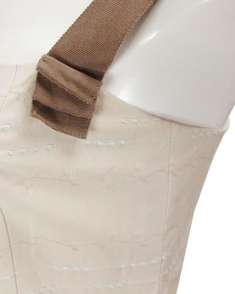 | フィットアンドフレアーのフォクシーらしい上品なワンピース。上品なベージュに刺繍が入った高級感のあるデザイン。カーディガンやボレロをプラスして、フォクシースタイルが楽しめます。裏地裾のフリルにも手が凝っていて、高級感があります。 |