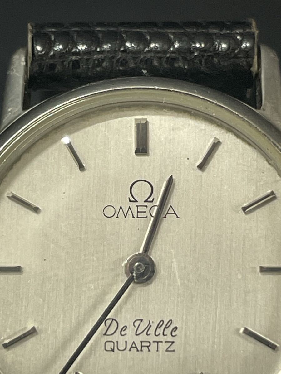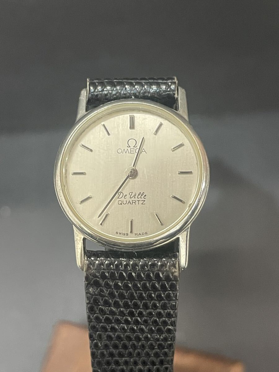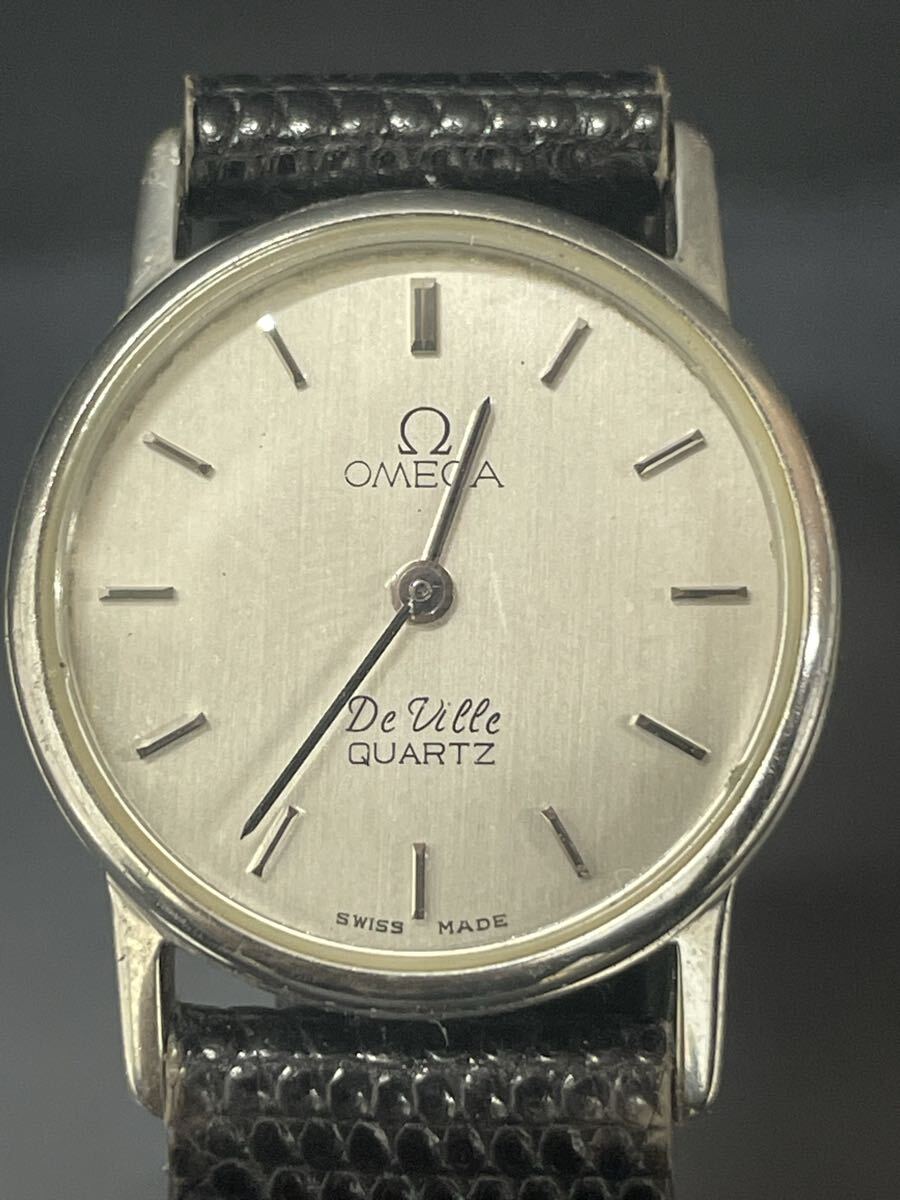 シンプルでエレガントなOMEGA De Villeクォーツ腕時計、スチールケースとレザー製バンド。