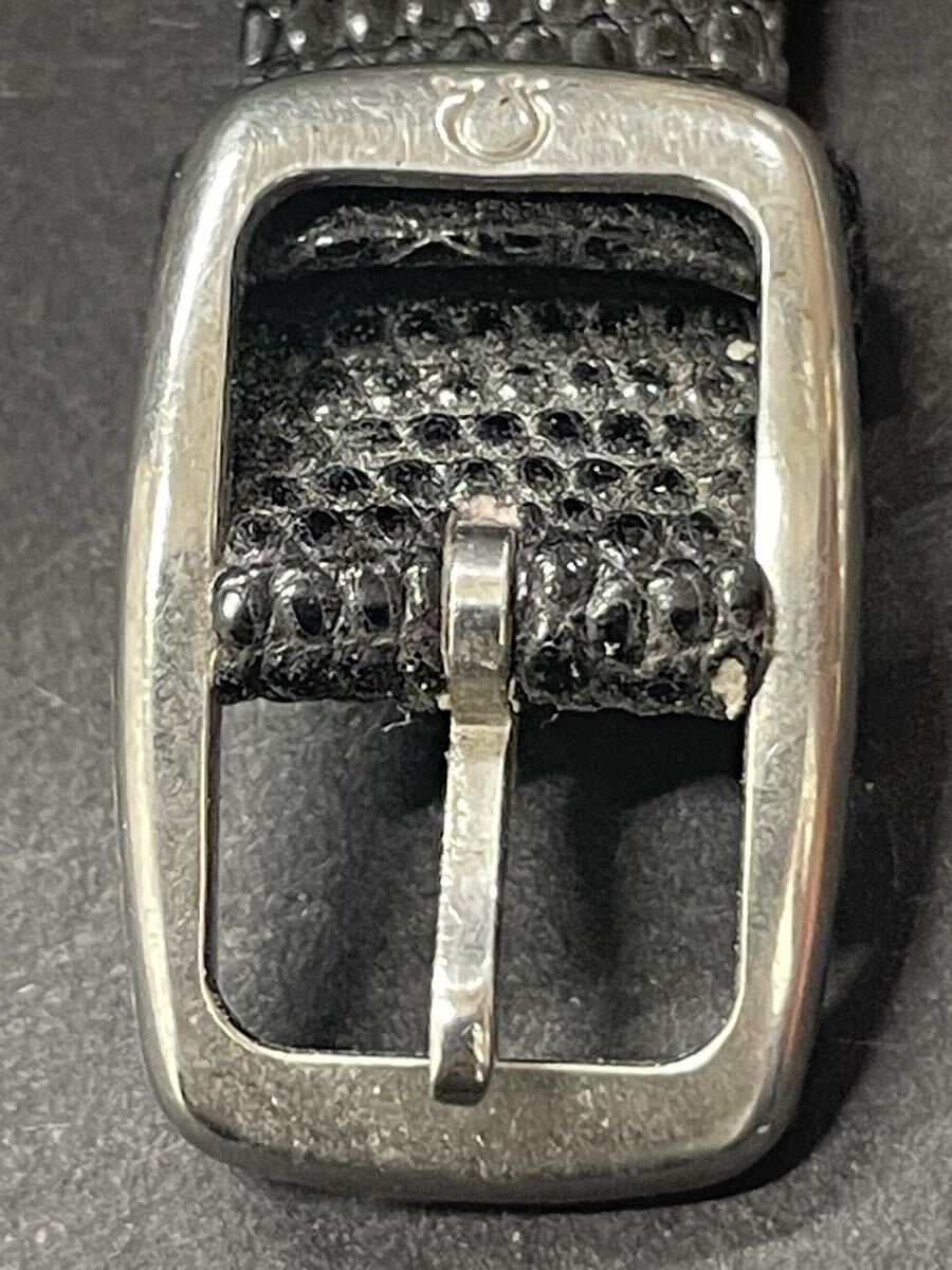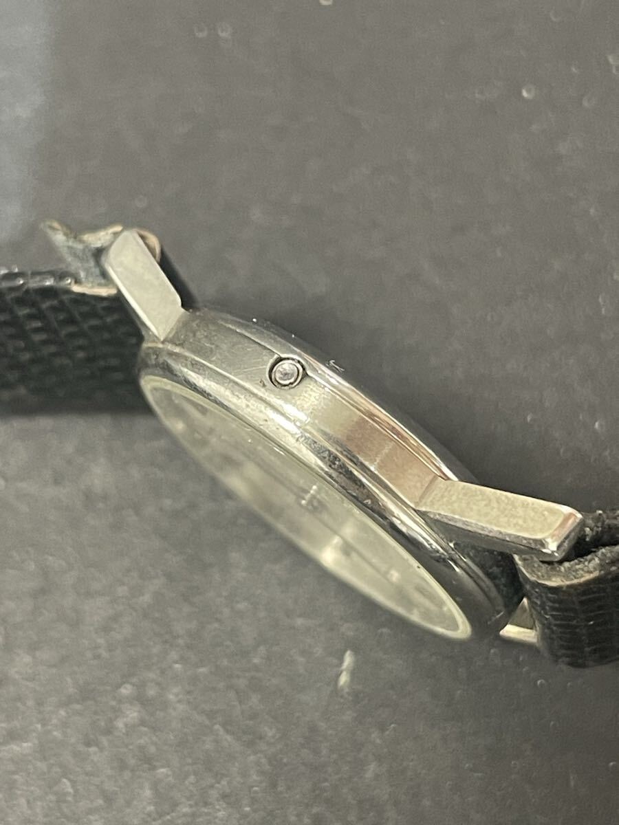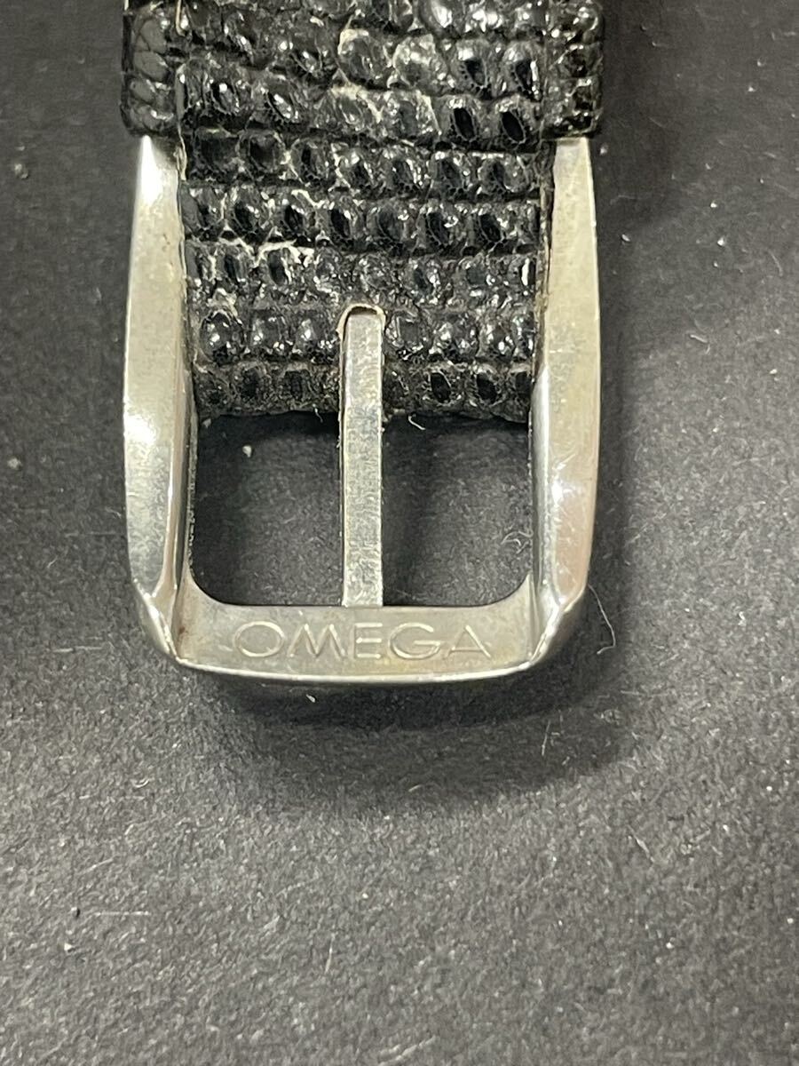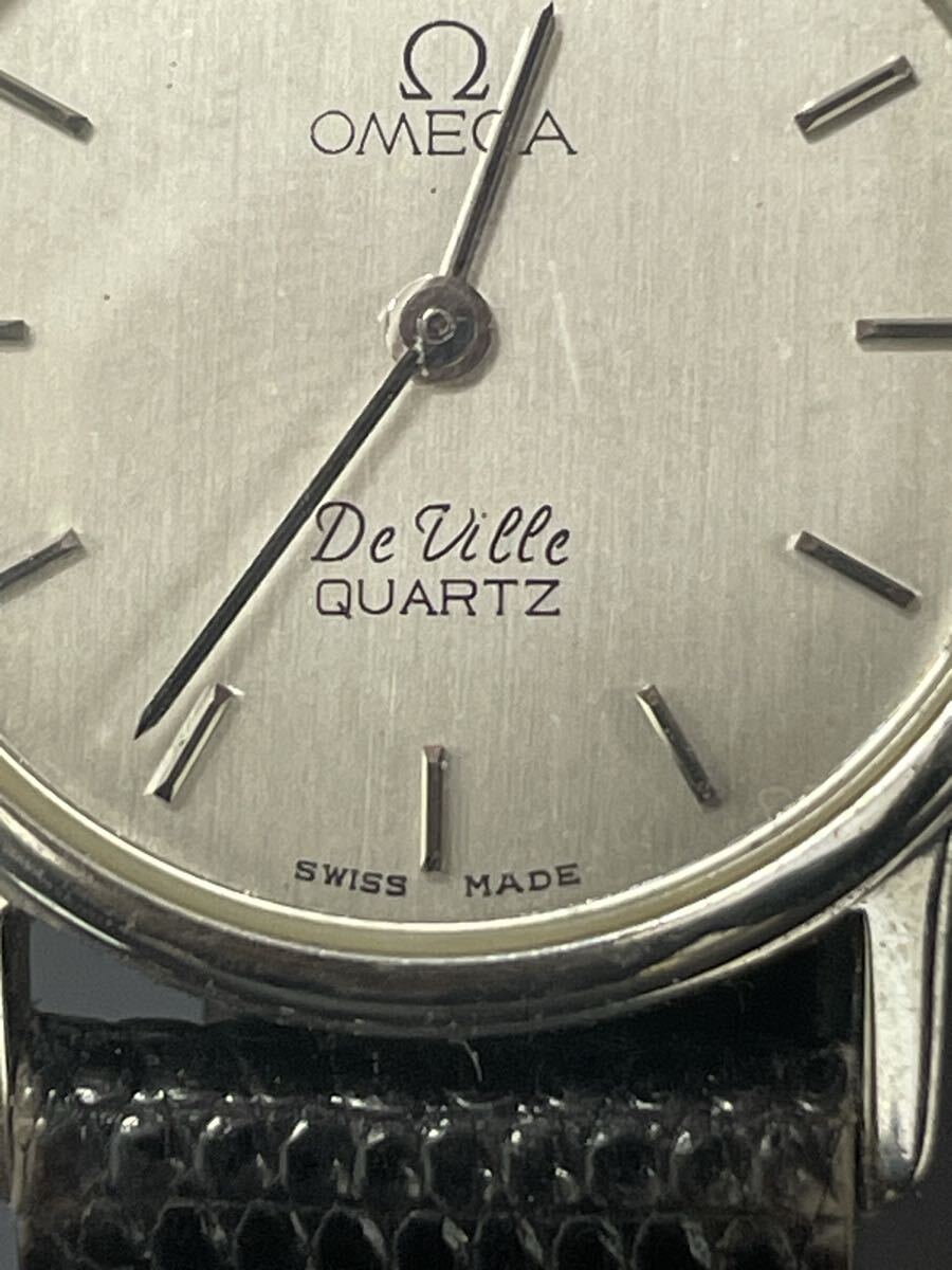 シンプルでエレガントなOMEGA De Villeクォーツ腕時計、スチールケースとレザー製バンド。