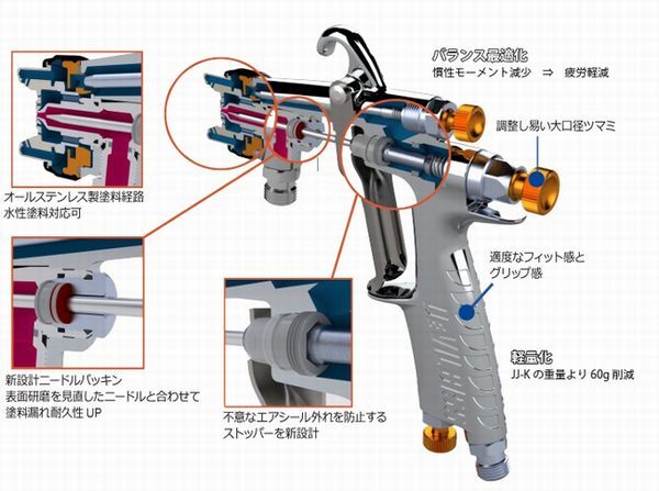 軽量・小型・高性能高微粒化と操作性に優れた高性能な一般工業用の小型汎用スプレーハンドガン エアキャップ ST1(パターン180mm)ノズル口径 1.3mm吐出量 95ml/分(手元エア圧力0.2MPa)エア消費量 240L/分ガン本体重量 290g |