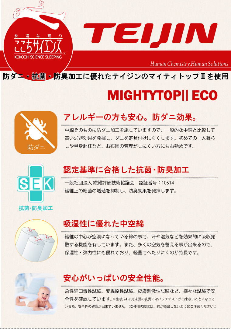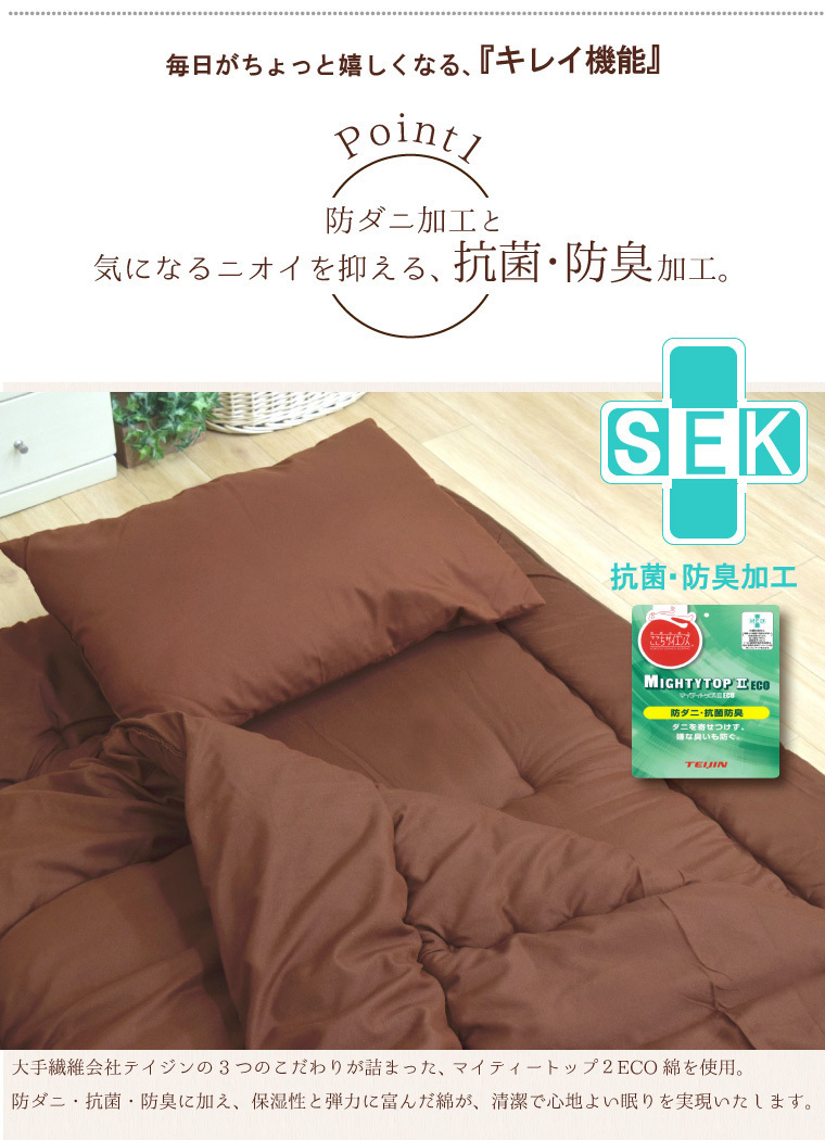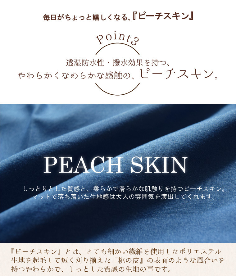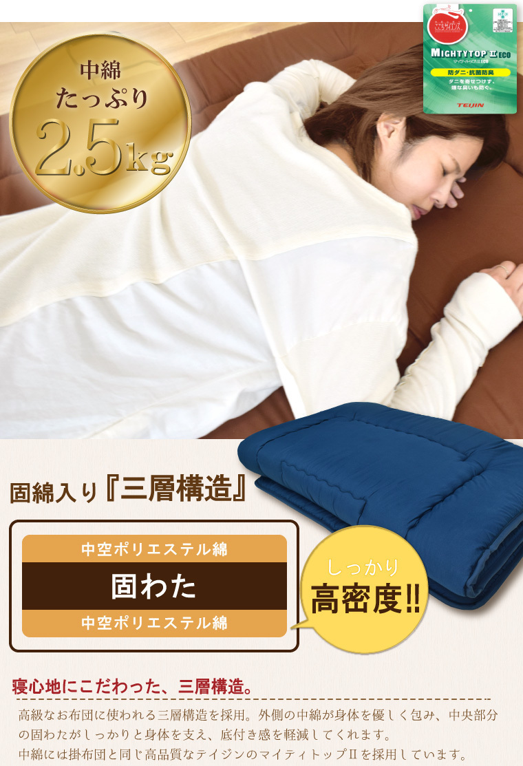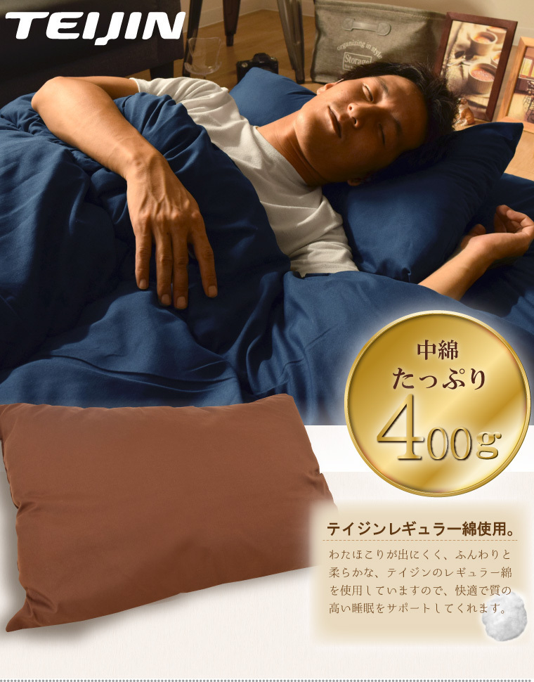 | ■仕様 | ・表の生地はやわらかなピーチスキン。カバーの着脱もスムーズです。 ・中材には防ダニ・抗菌防臭効果加工を施したTEIJINの綿を使用 ・中綿たっぷりでふかふかな寝心地。睡眠時間をより充実させます。 |
