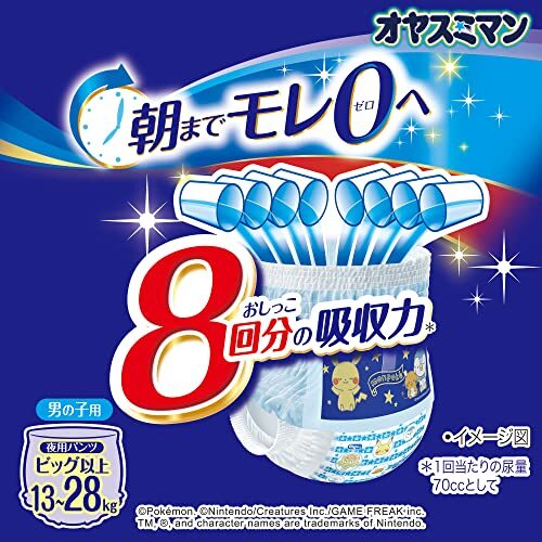 ・白 ビッグより大きいサイズ (24個) ・・Size:ビッグより大きいサイズ (24個)・子供用おむつ・パッケージ重量: 1.26 kg・種類: カートゥーン・色: 白オヤスミマンはおしっこ6回分の吸収力で、朝までモレ0へ! おやすみシール搭載で、寝る前ルーティンが身に付きます。すっぽりハイウエスト搭載でどんな寝相でもお腹をやさしく包み込みます。夜のスペシャルデザインでおむつを嫌がるお子様にも気に入って履いてもらえます。