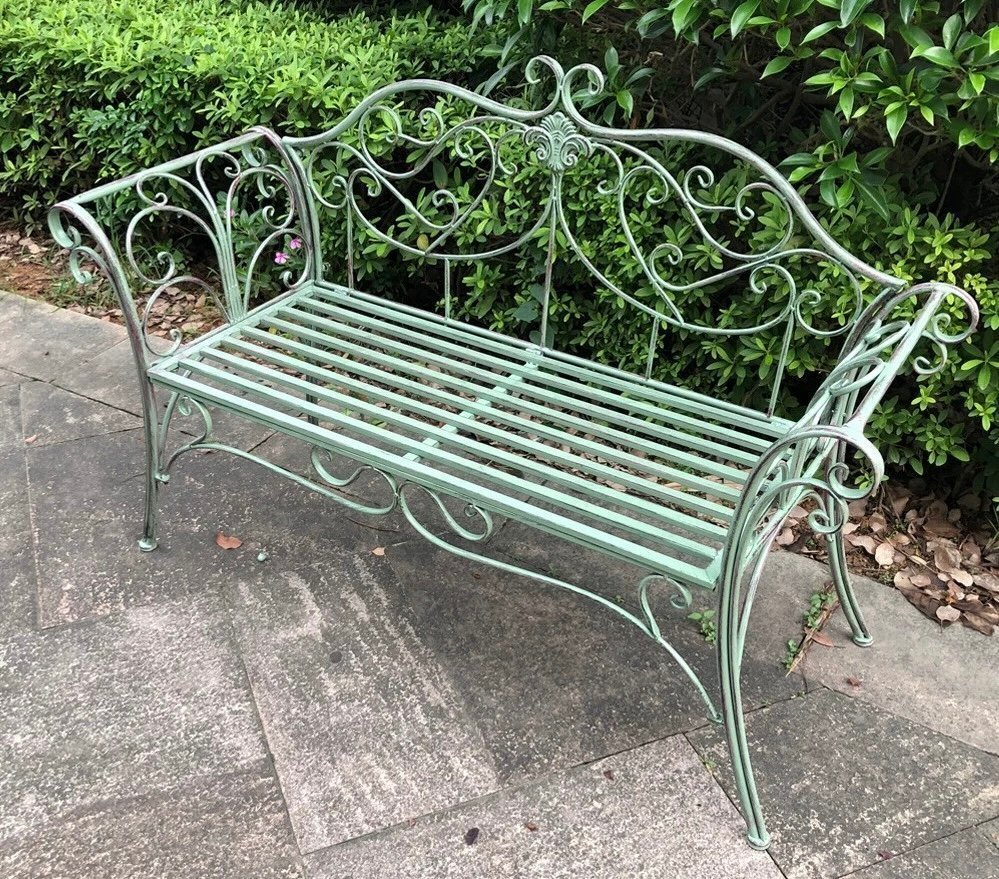 レトロなスタイルのガーデンベンチ、手作り、古いスタイル、ロマンチックな色っぽい気持ちに満ちたグリーン。美しい錬鉄の形がポーチ/テラス/中庭に優雅さを加えます。