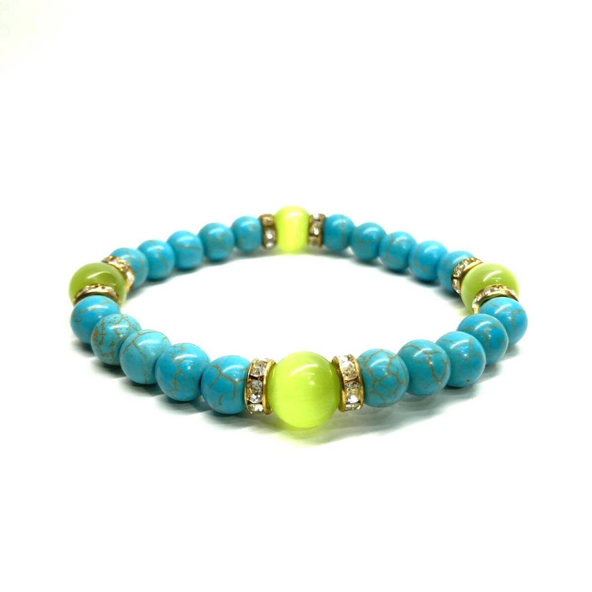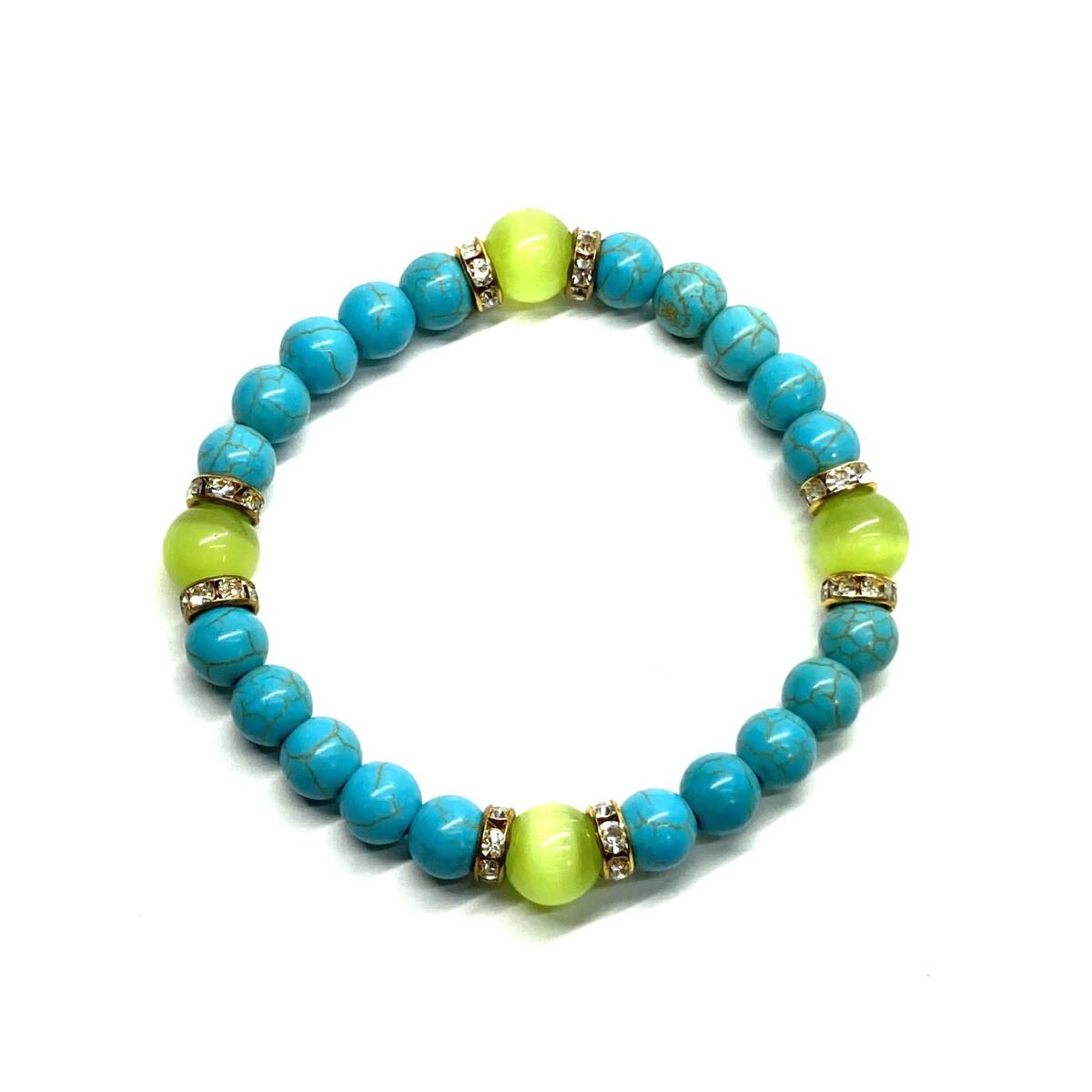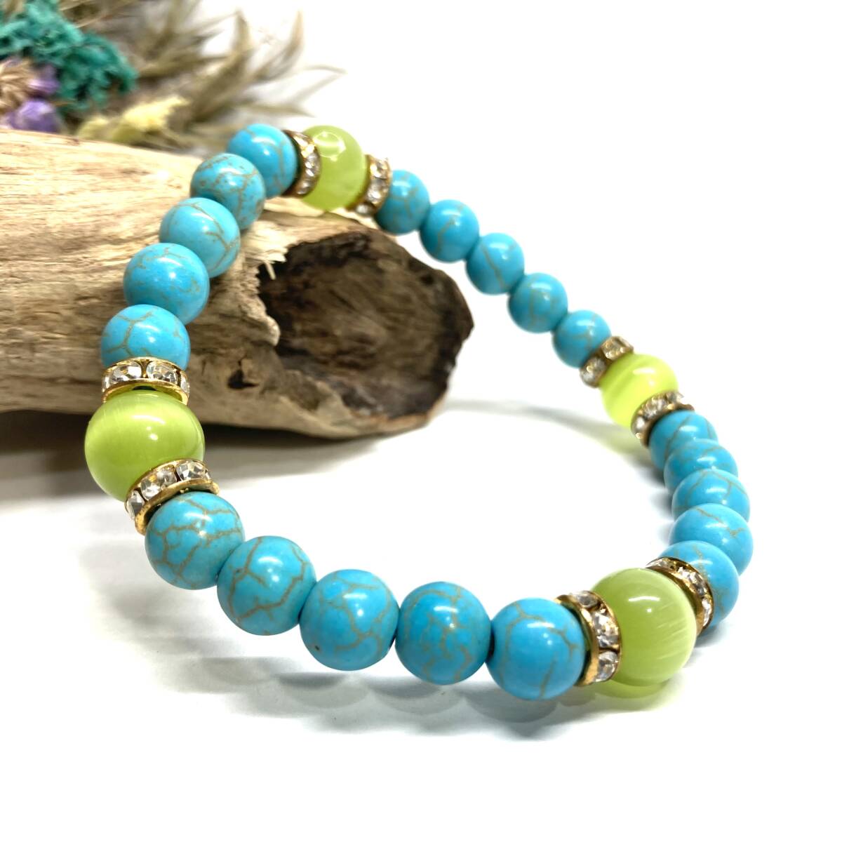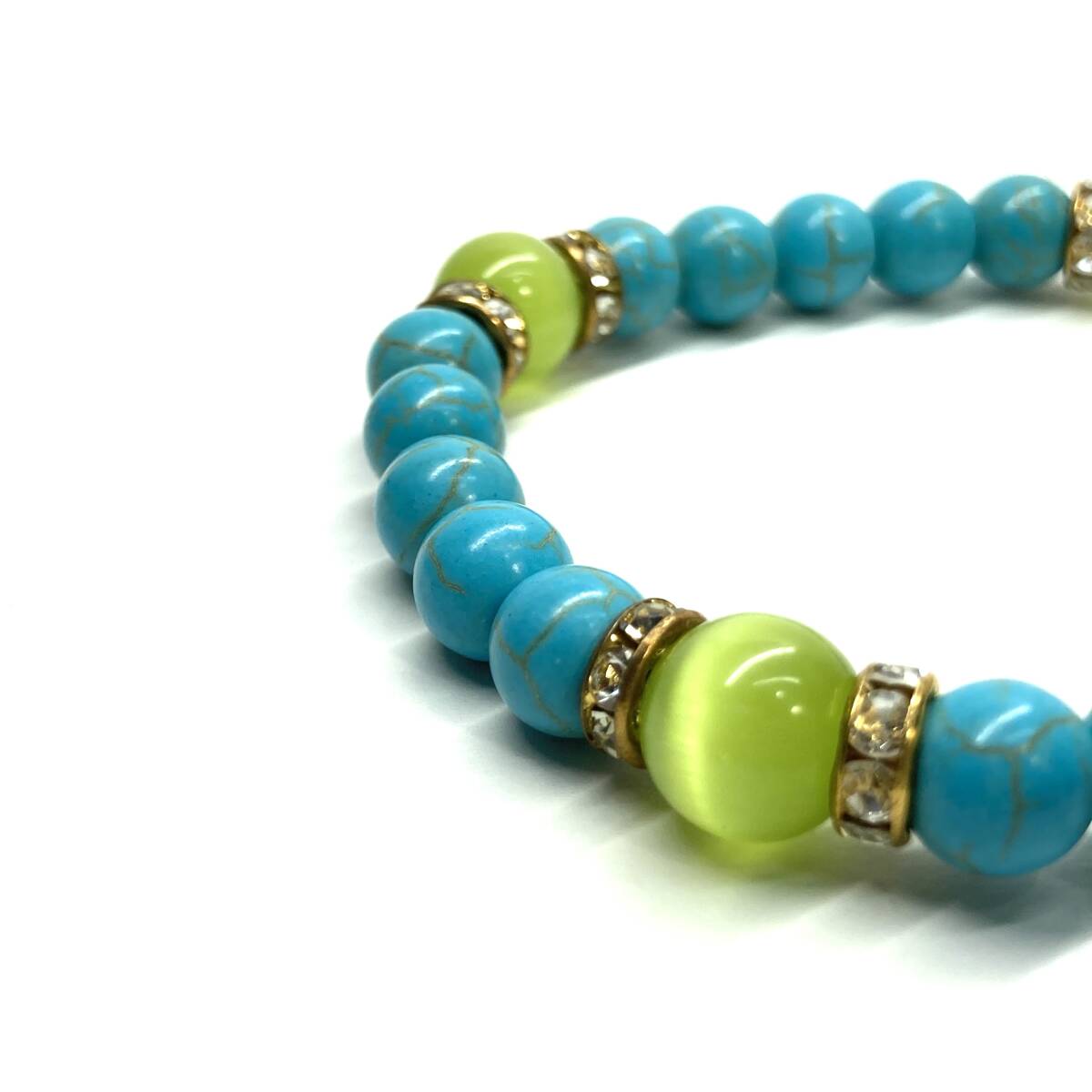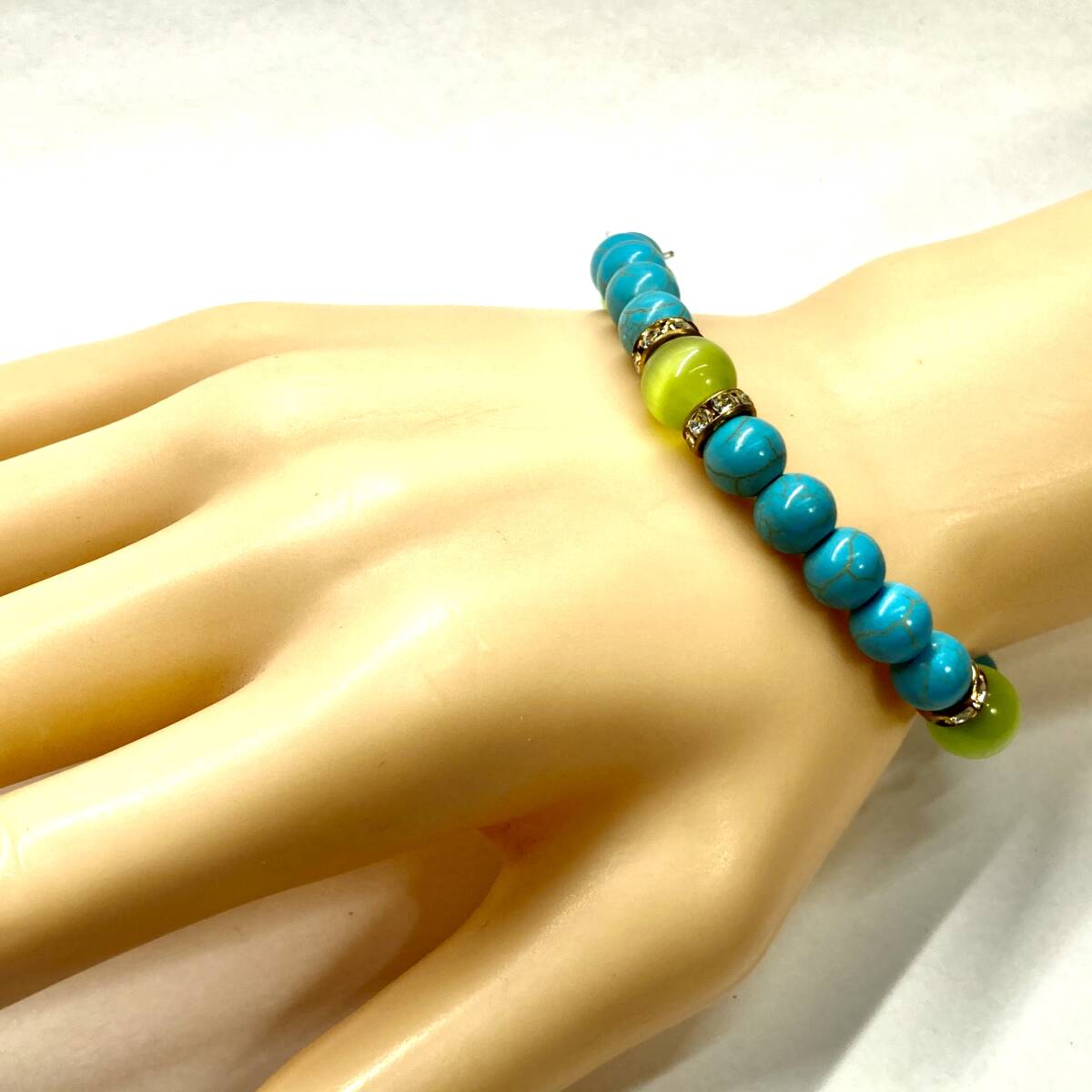 こちらは、8mm玉のキャッツアイとターコイズを使用したパワーストーンブレスレットです。間にはロンデルを挟み高級感ある大人っぽいデザインに仕上がっています。内周約17cmです。気になる方は是非この機会にどうぞ。