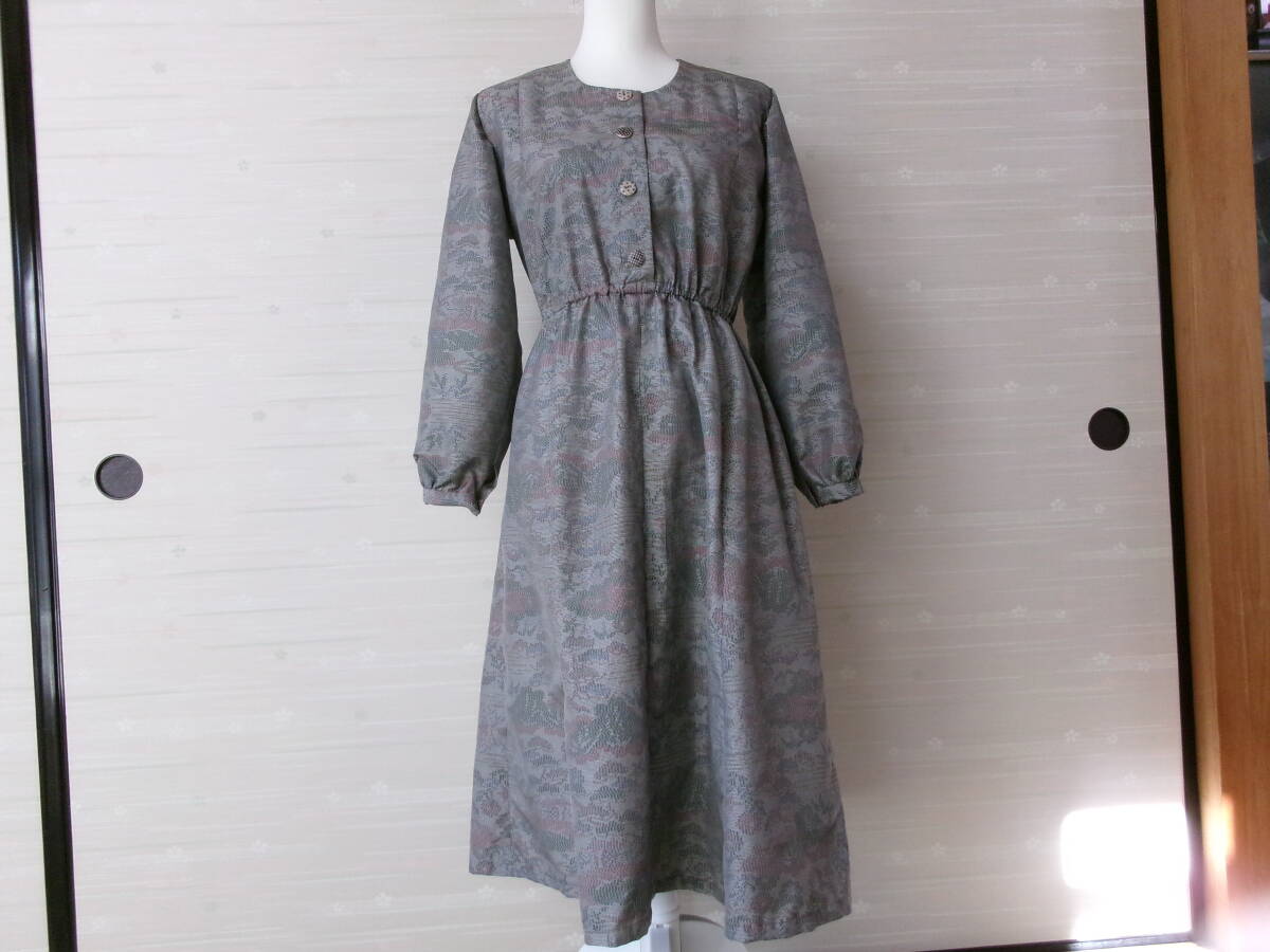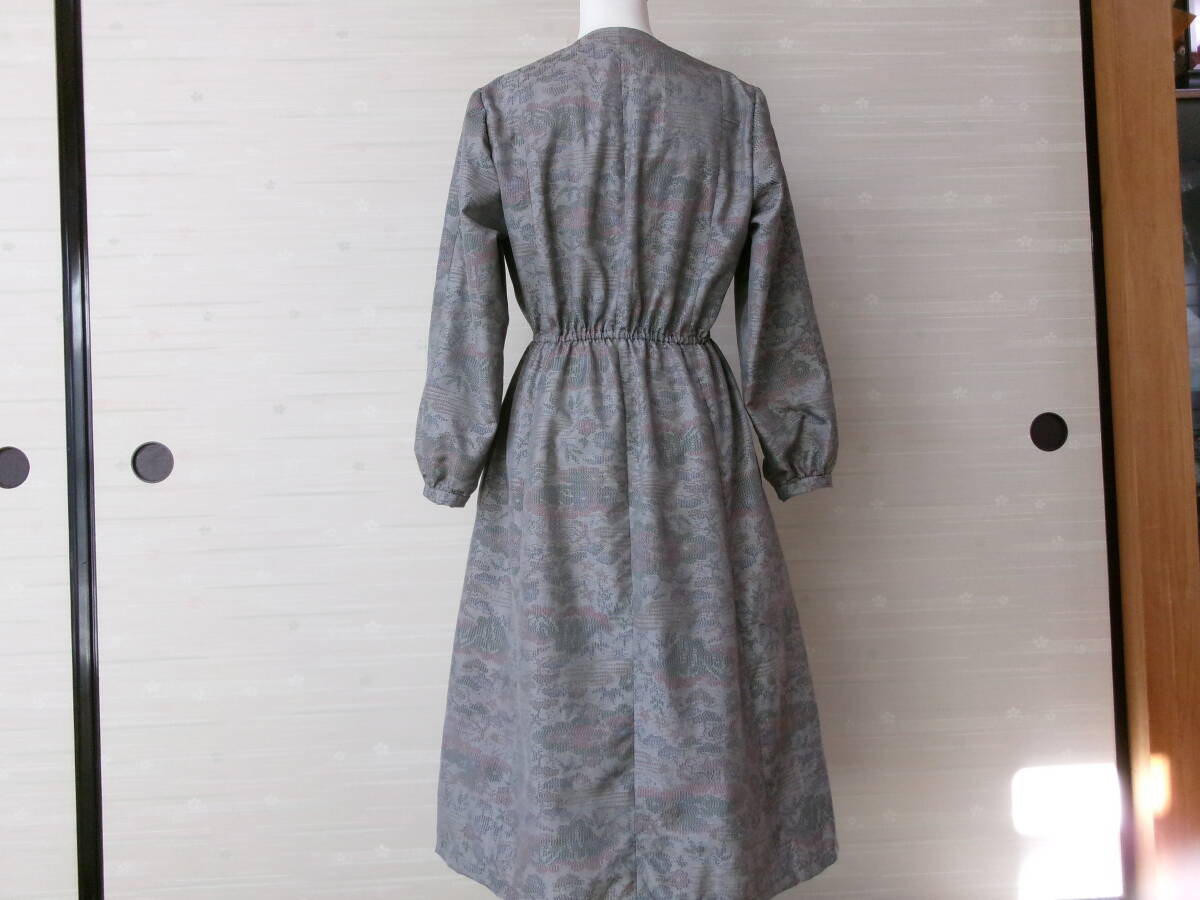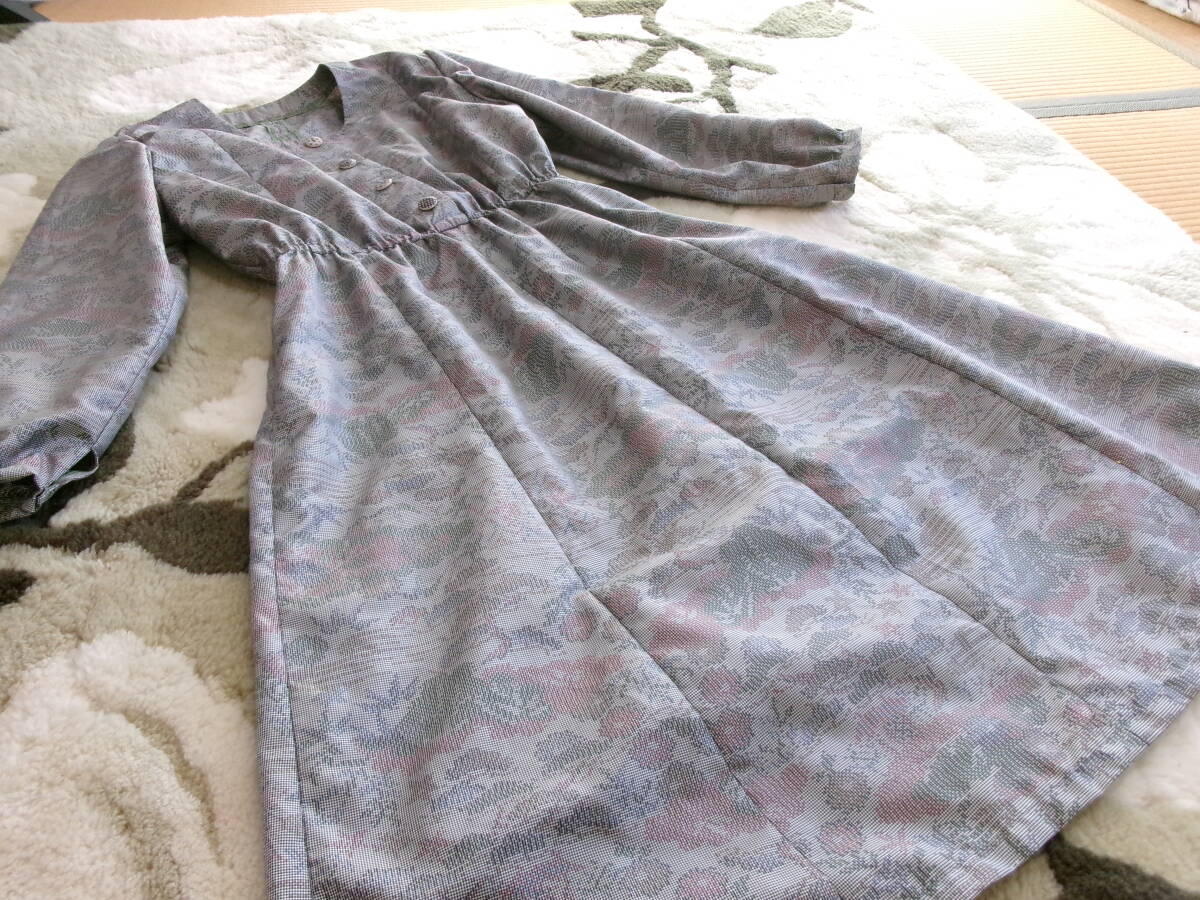 着物リメイク★お洒落な長袖ワンピース③★正絹★Lサイズ★共布ボタンホール★ウェストゴム調節可能★袖ぐりバイヤステープ仕上げ
