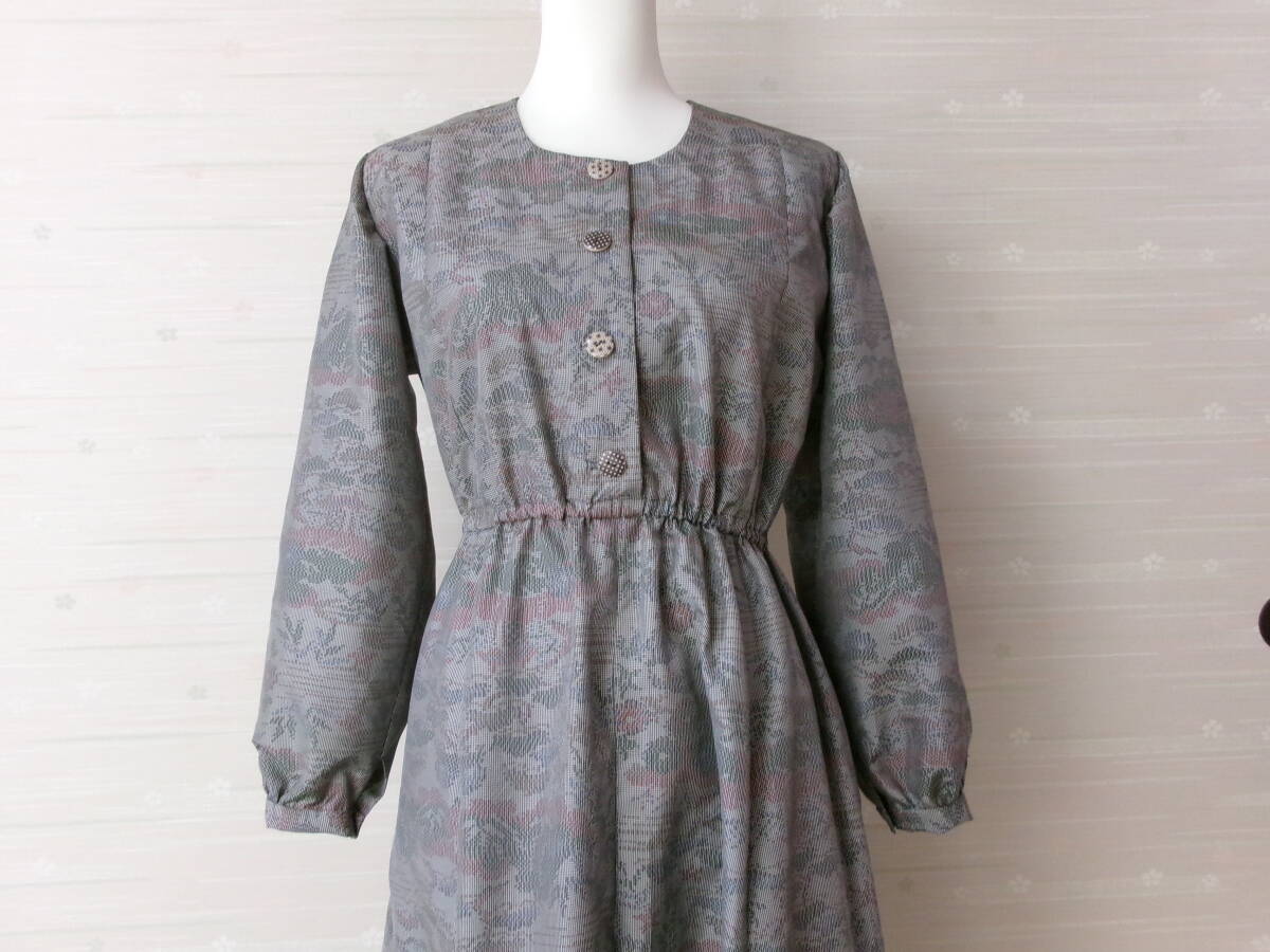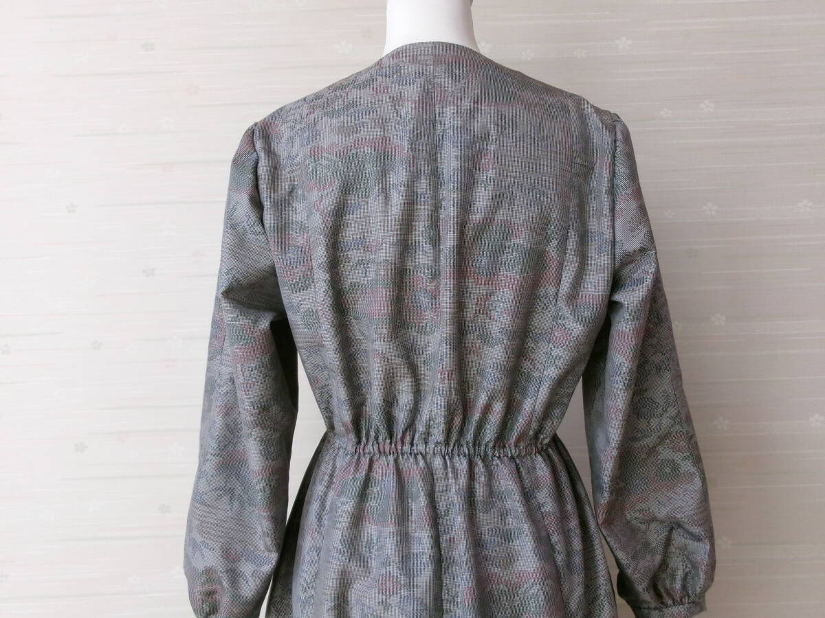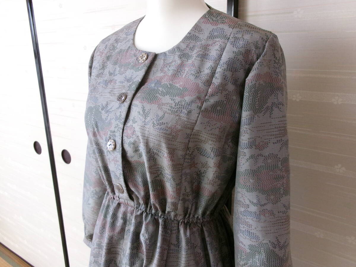 着物リメイク★お洒落な長袖ワンピース③★正絹★Lサイズ★共布ボタンホール★ウェストゴム調節可能★袖ぐりバイヤステープ仕上げ