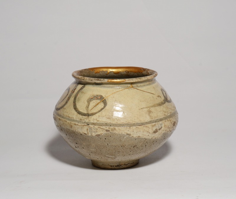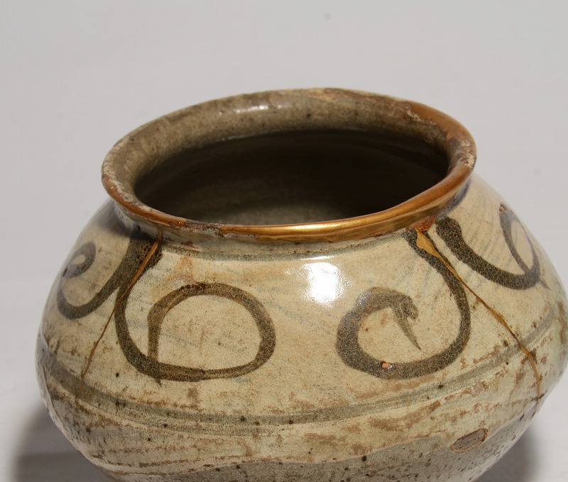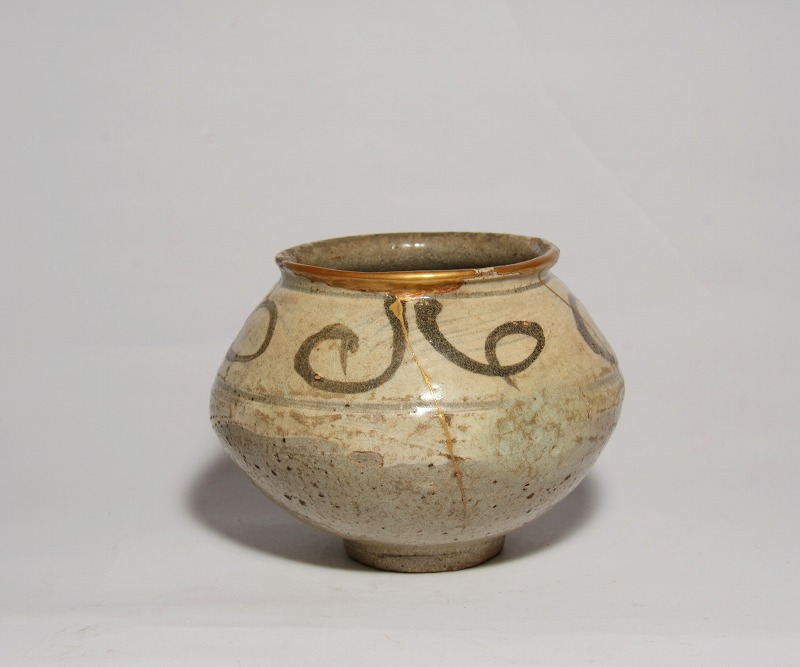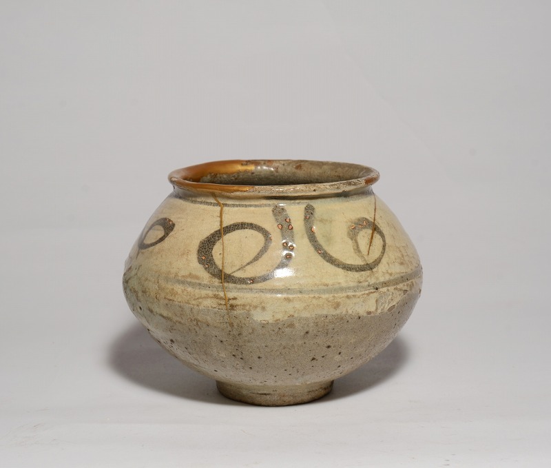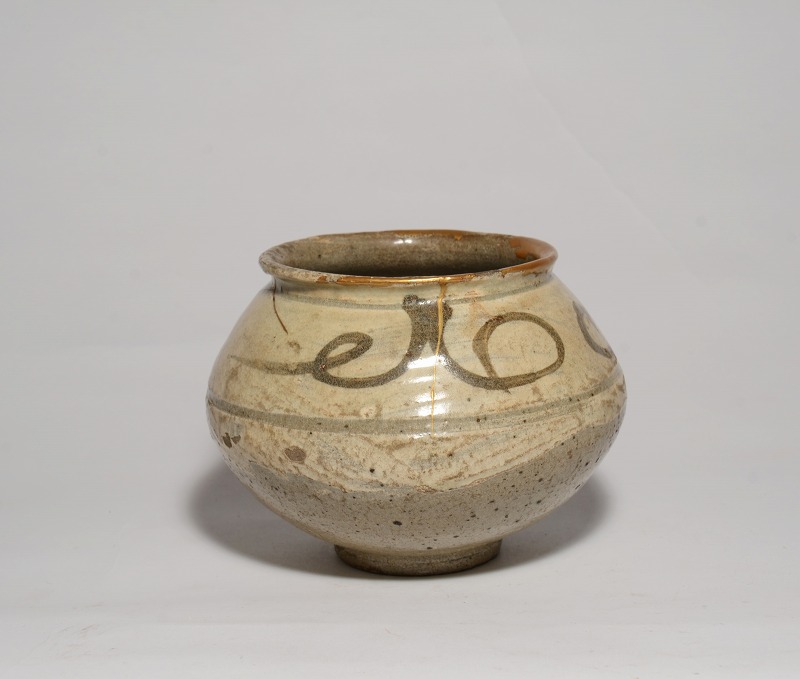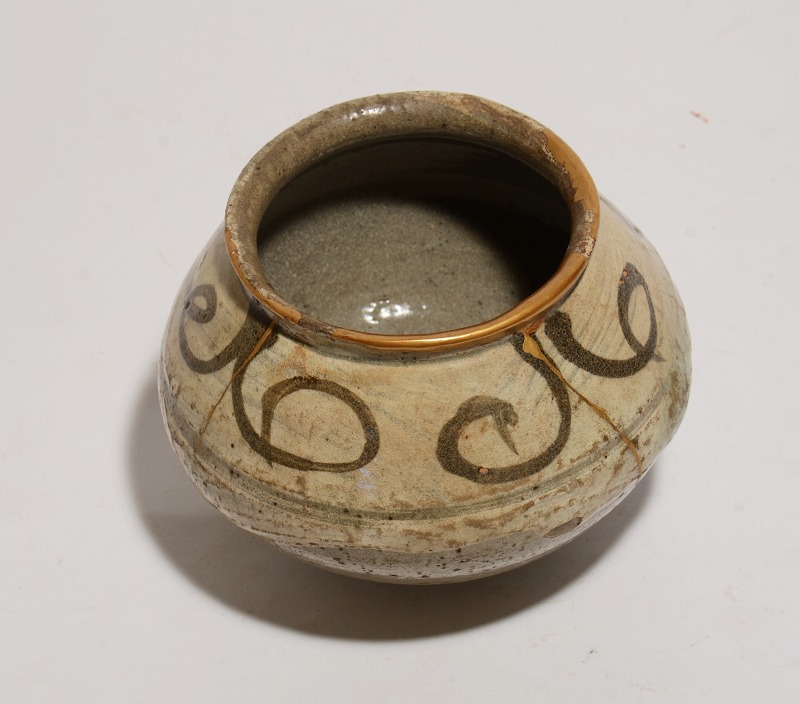 朝鮮時代初期(16世紀初頭)の鶏龍山絵刷毛目小壺です。コロンとした形が好ましく、カセや釉の剥落がなく、ご覧のようにアガリは抜群です。伸びやかな絵付けもまた魅力的で見応えのあるものです。大きさは、径:約9.6cm、胴幅(最大):約13cm、高さ:約10.3cmです。見たままの状態で、口縁のホツレとニュウには丁寧な本金修理が施されています。その他、傷や共修理等はございません。皆様、どうかよろしくお願いいたします。