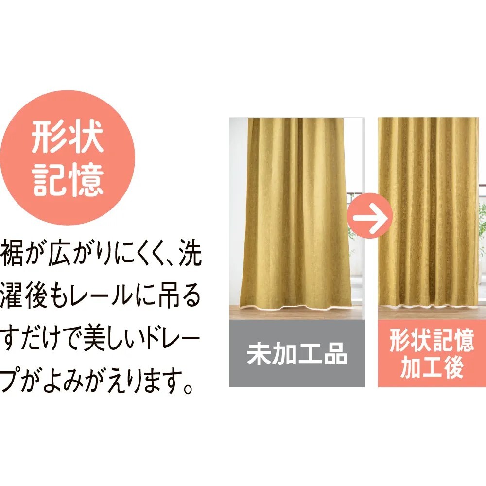掛けた時に美しいシルエットになるよう形状記憶加工を施しました。開いても閉じても裾が広がりにくく、美しいドレープを保ちます。洗濯後もレールに吊るすだけで美しいドレープがよみがえるので、アイロンいらずです。