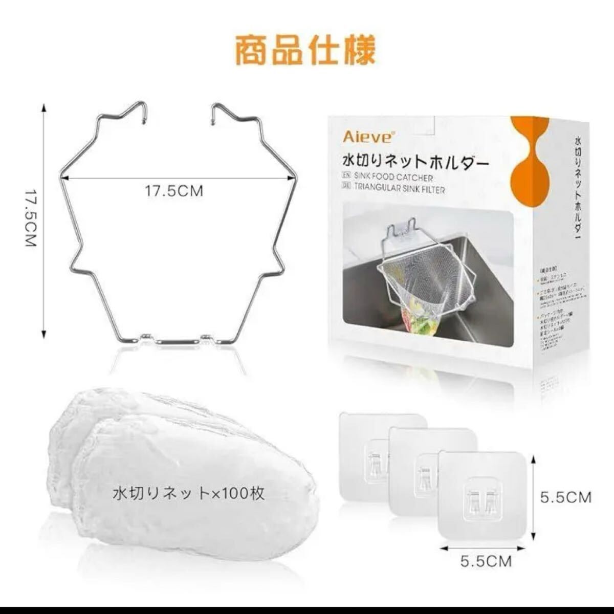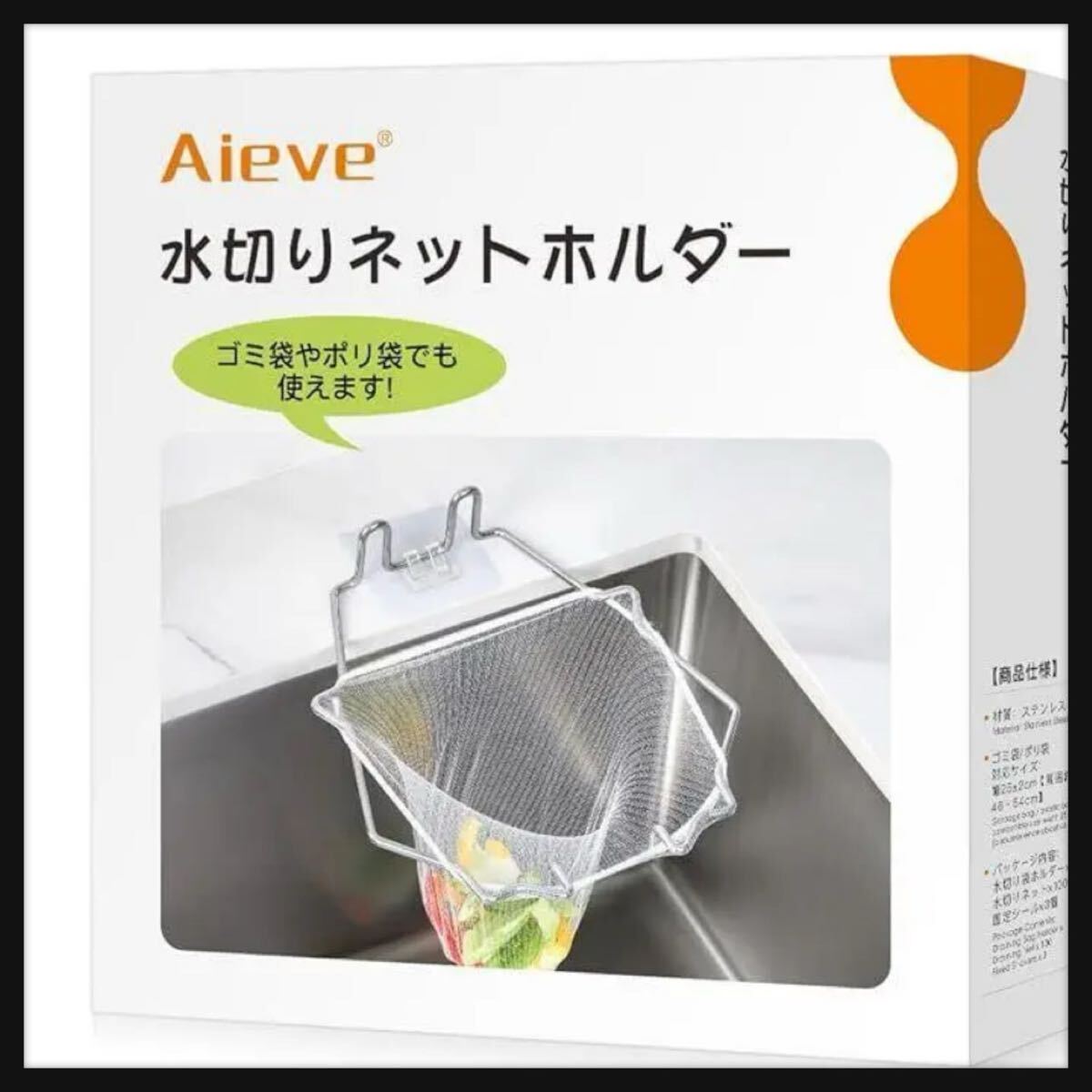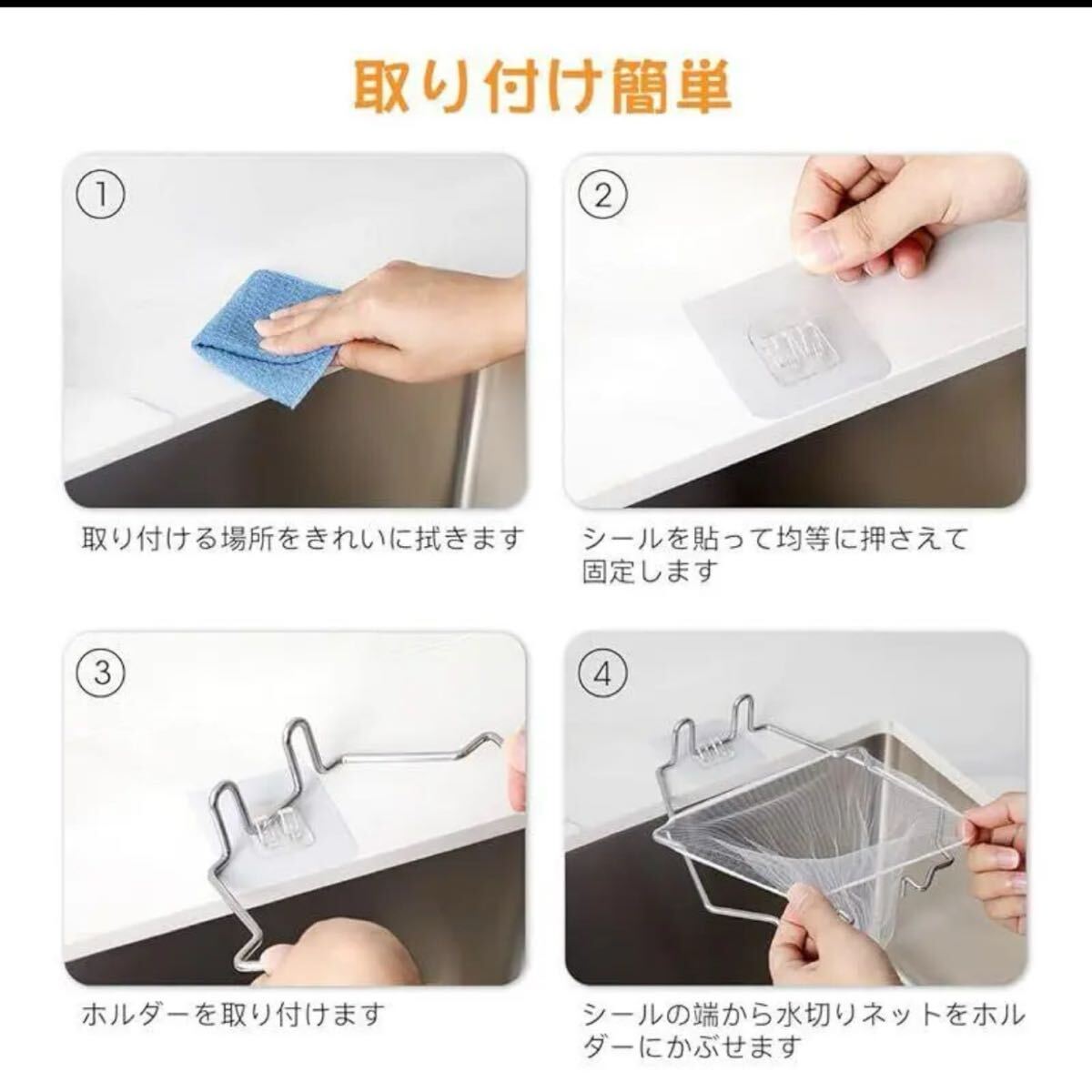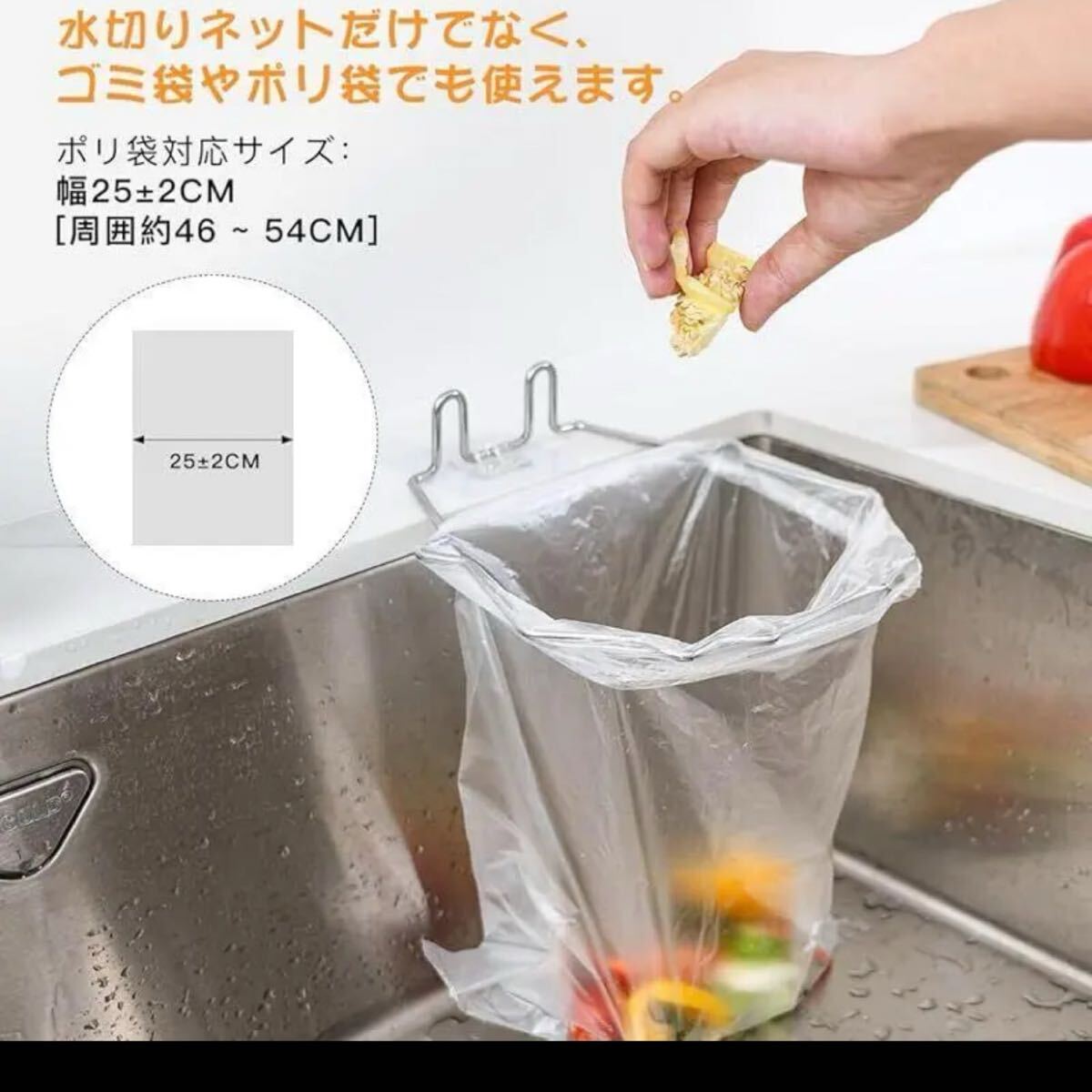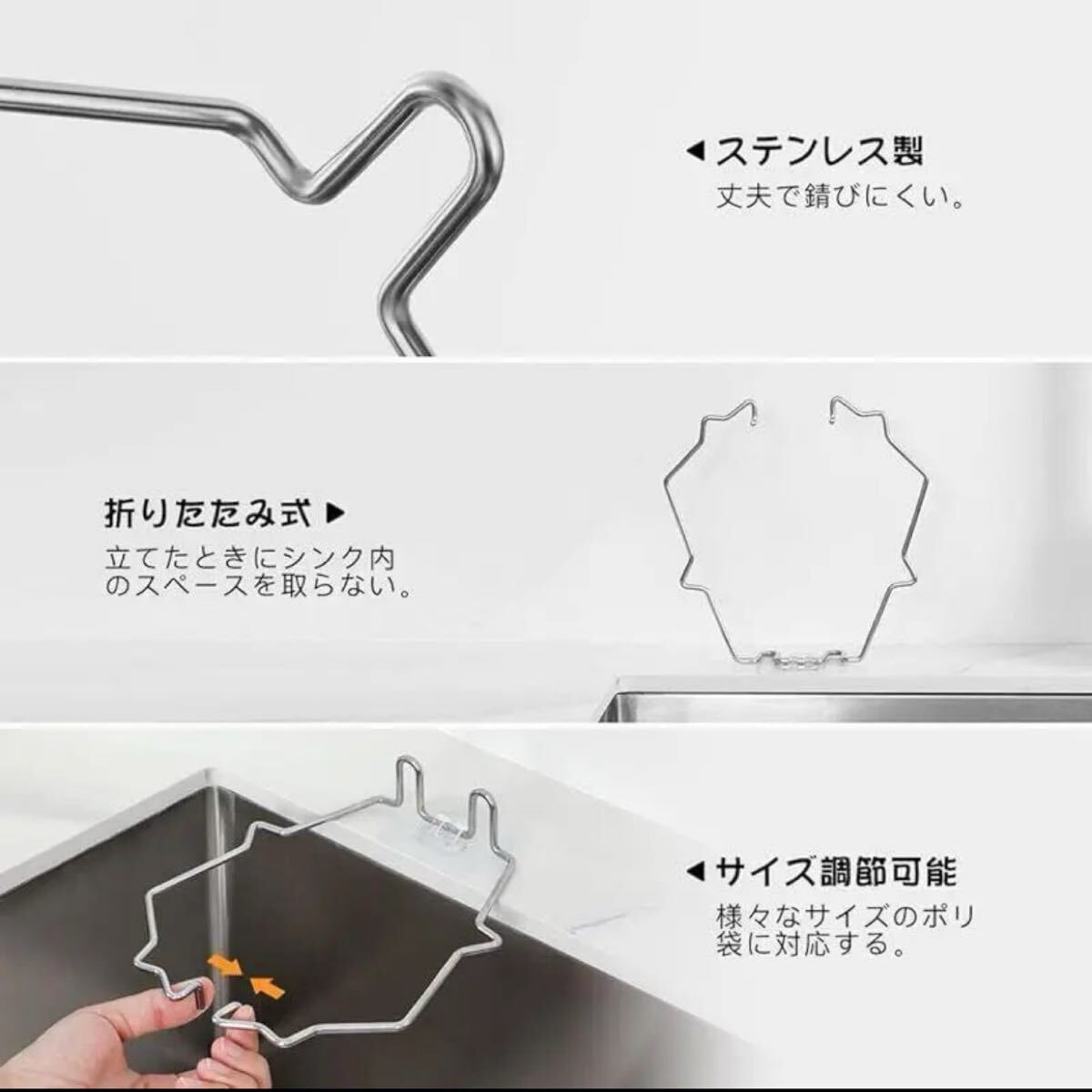 【高品質】ポリ袋ホルダーはステンレス製で丈夫で錆びにくく、簡単な構造なので洗いやすいです。水切りネットのメッシュは細かいので、小さなゴミもしっかりとキャッチします。使い捨てなので便利かつ衛生的です。