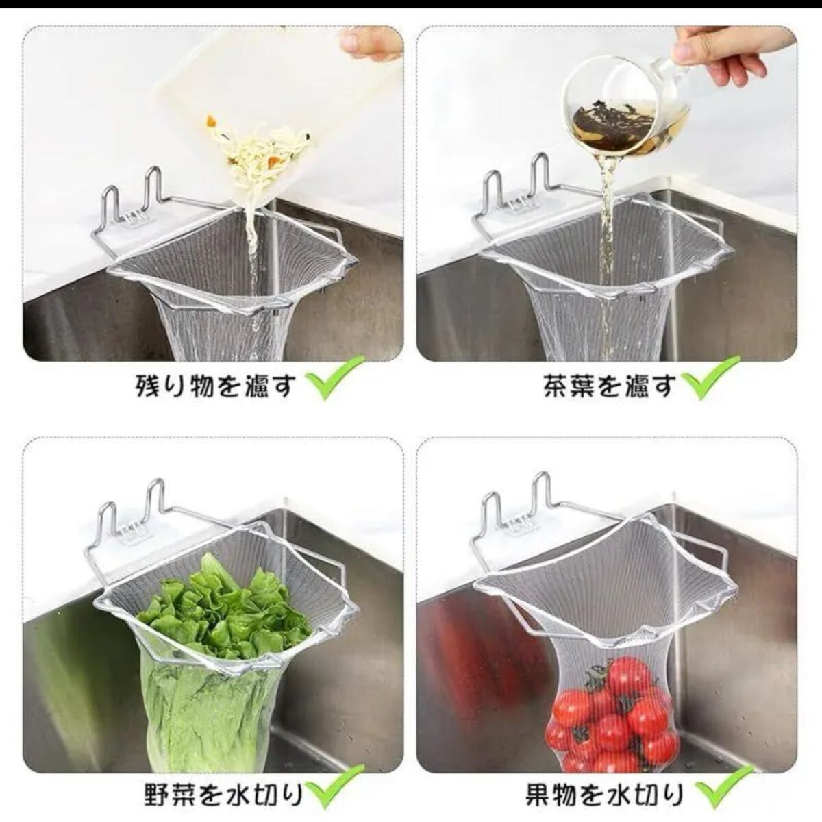 【実用性】残り物や茶葉の濾し、シンクの詰まり防止、掃除の手間を省きます。 洗った野菜や果物の水切りホルダーとしても使えます。水切りネットだけでなく、ゴミ袋やポリ袋でも固定できます。