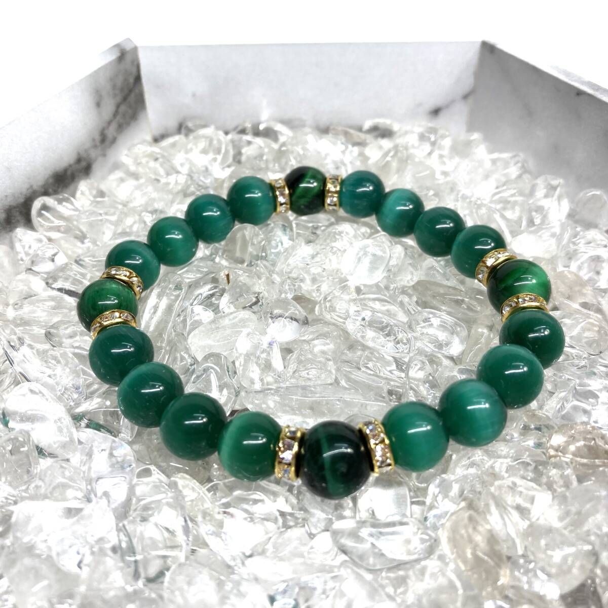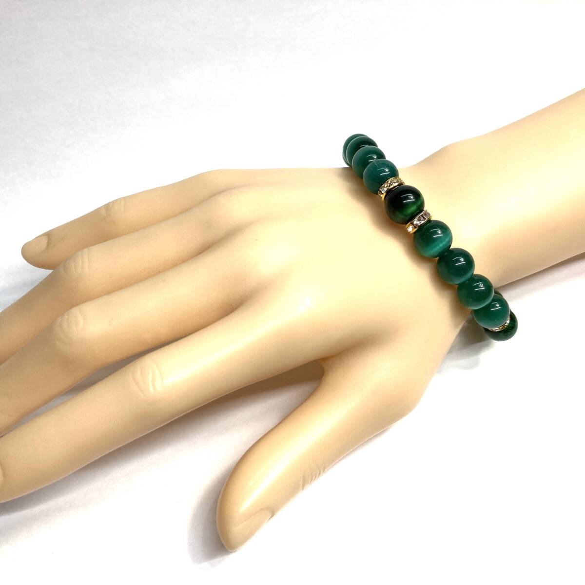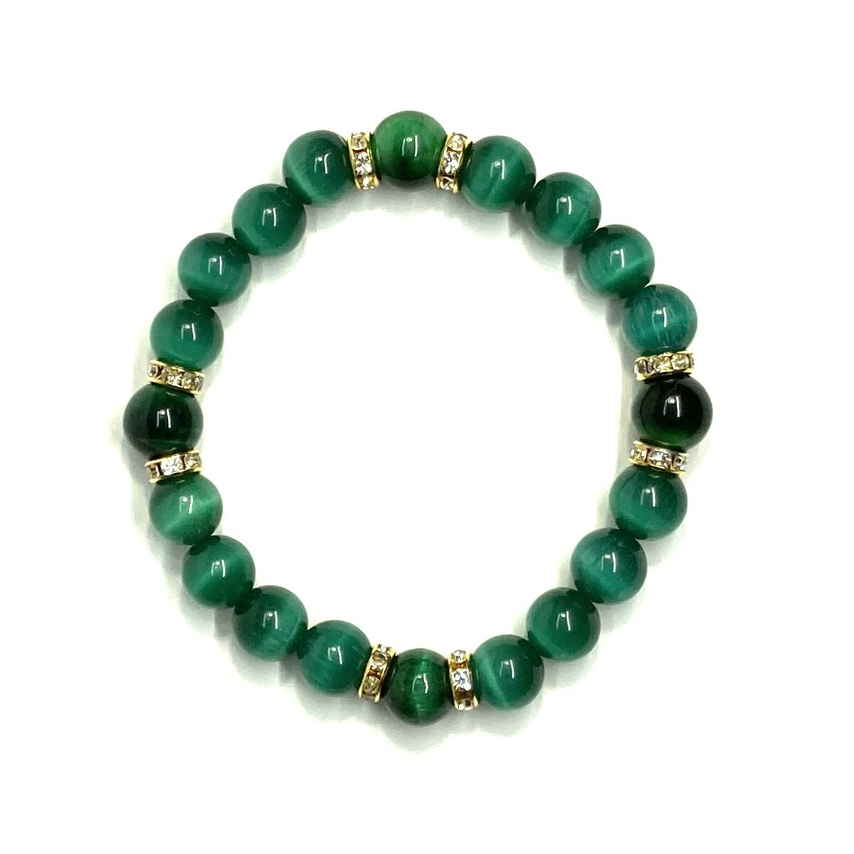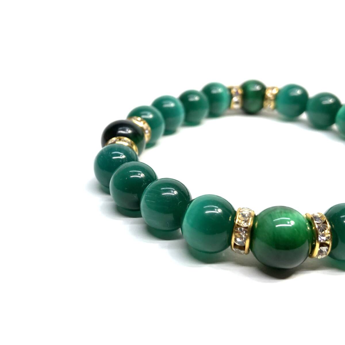 こちらは、キャッツアイとグリーンタイガーアイを組み合わせたブレスレットです。間にはロンデルを挟み高級感あるデザインに仕上がっています。石大きさは腕にも馴染みやすいように10mm玉で内周約17cmです。数に限りがございますので気になる方はお早めにどうぞ。