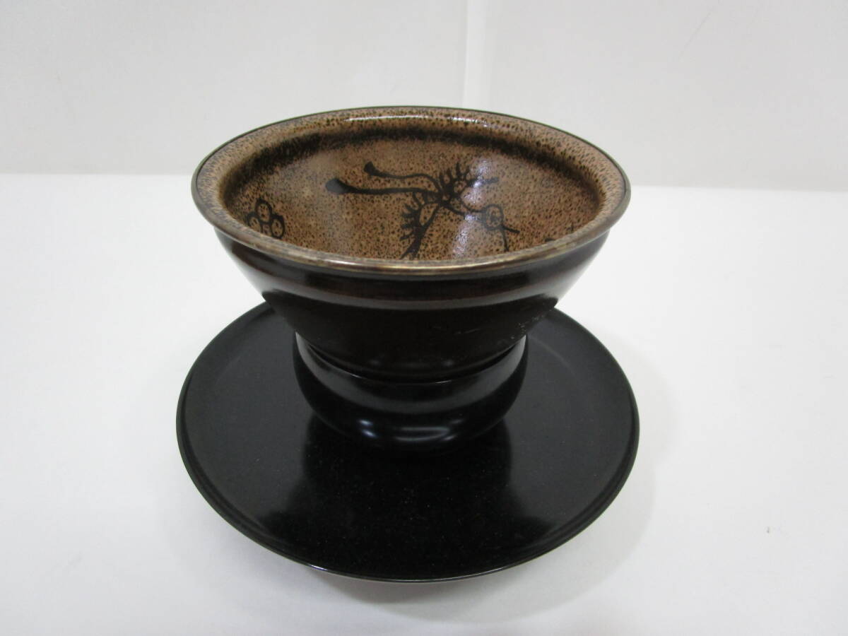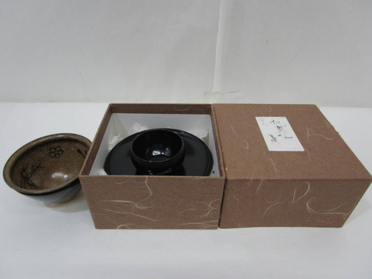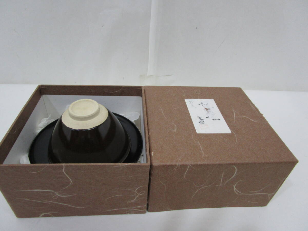 中古茶道具! 平安 万代草山作の 玳玻 天目茶碗 と 樹脂羽の天目台セットです。 使用品ですが未だ十分御使用頂けます。 即決品です。 合わせ箱ですが!どうぞ宜しく。