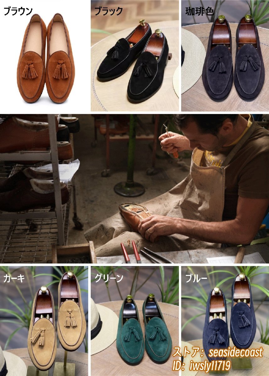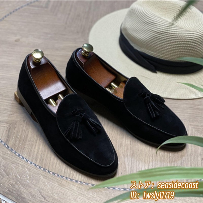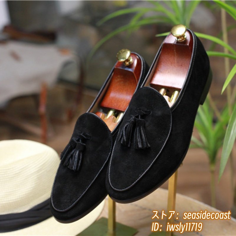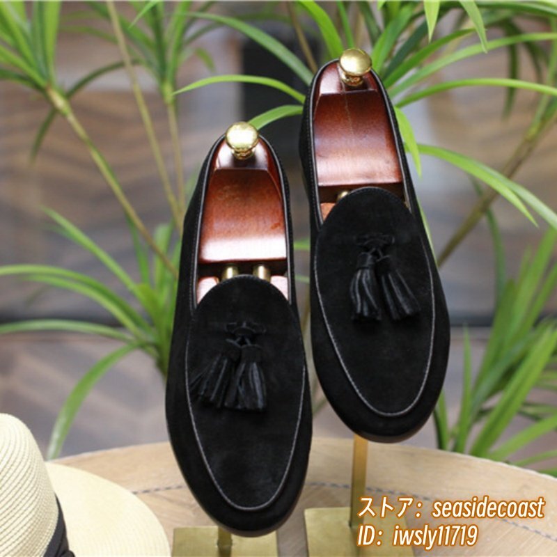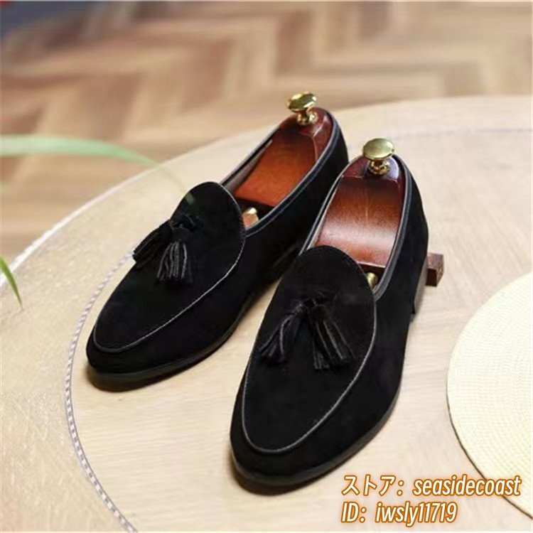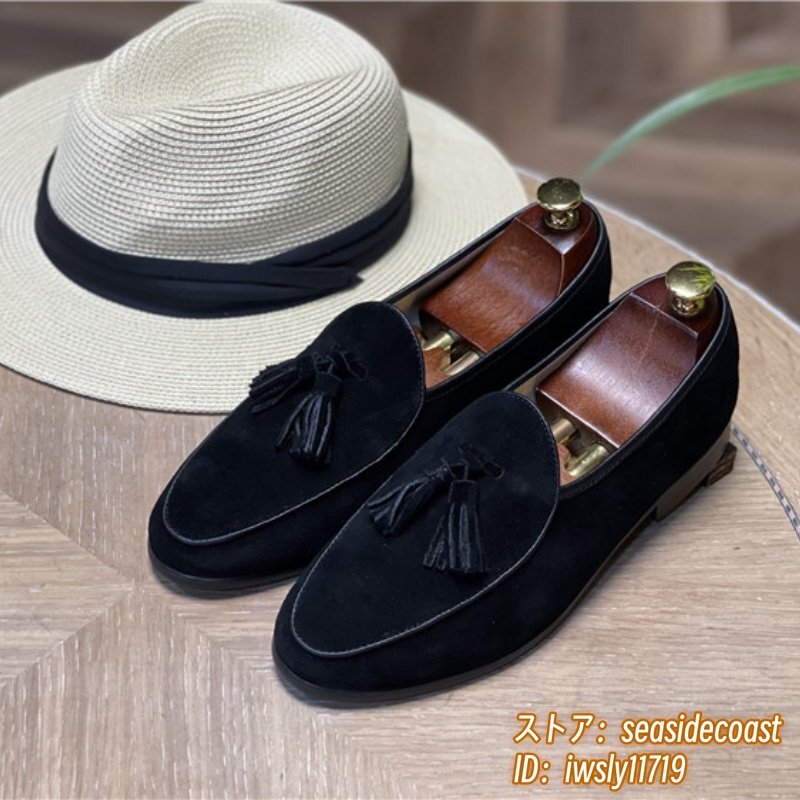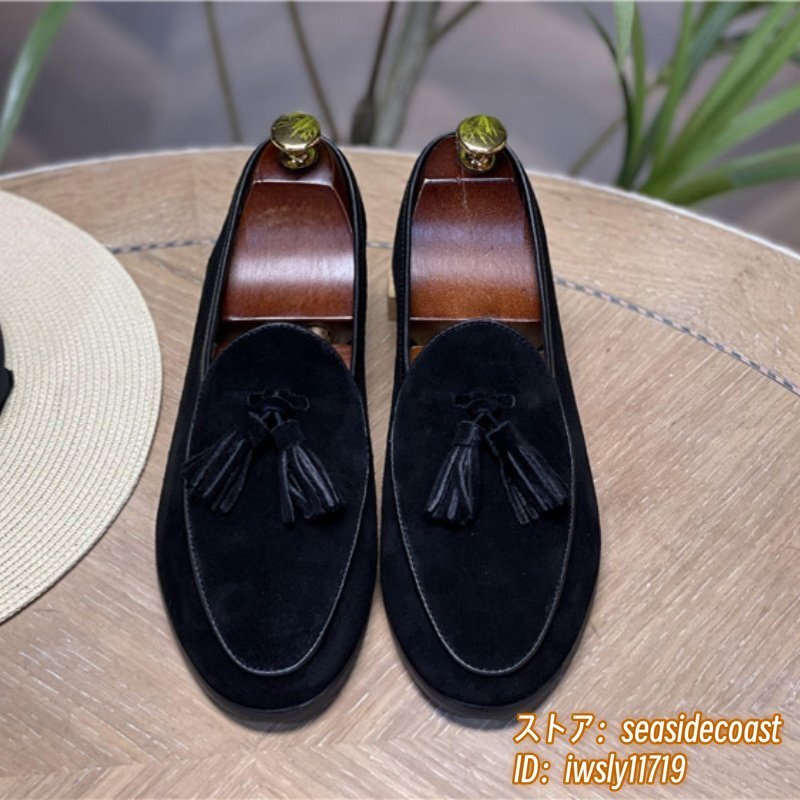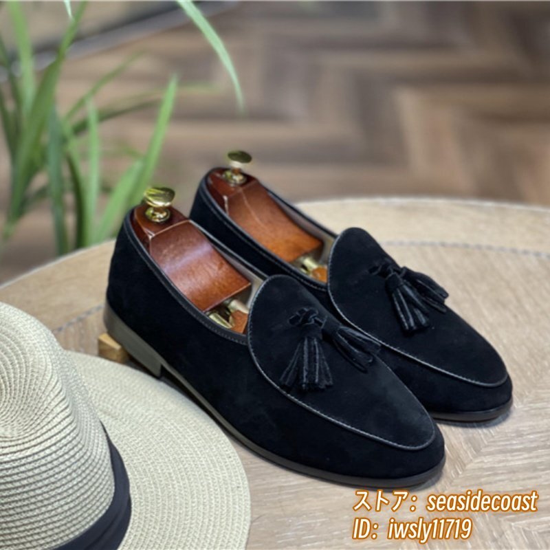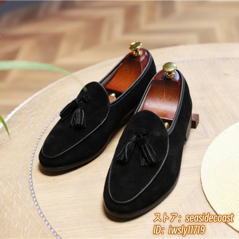 定価9万超★最高級 ビジネスシューズ 本革 レザーシューズ 職人手作り フリンジ 紳士靴 スエード 牛革 ドレス 結婚式 革靴 ブラック 25.5cm