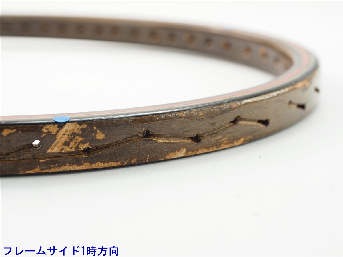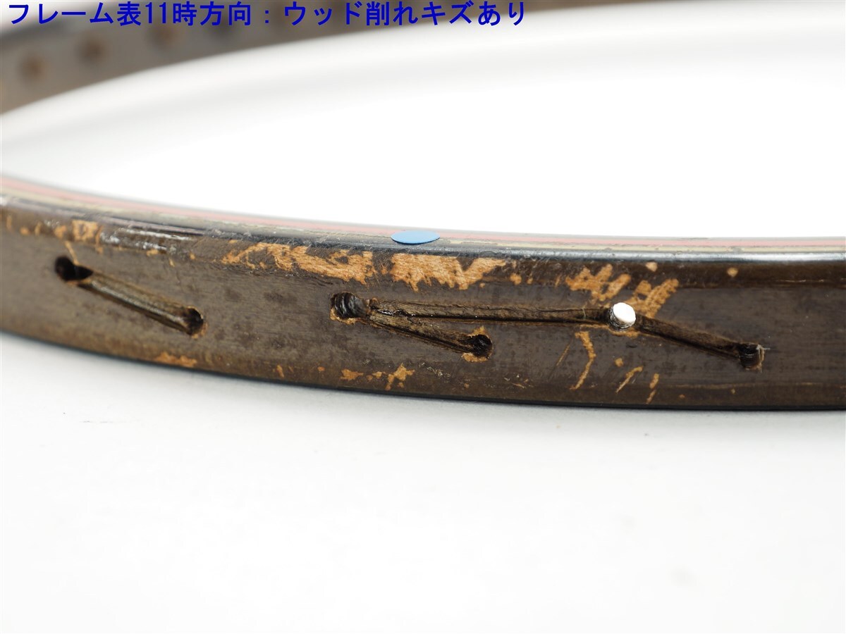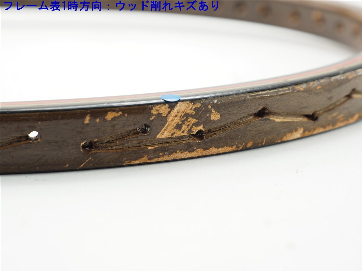 ラケット全体的にかなり傷んでる状態で、特にトップ部分には表面のウッドが削れて塗装が剥げてる状態で目立ちます。それ以外にもシャフトなどにも細かいキズは多くかなり使用感はあります。反りや歪みはありません。