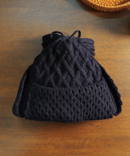 参考商品名:発熱糸 ケーブル編み 耳当て付き 2Way フリンジ ニット帽