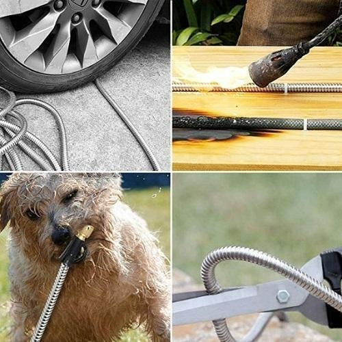 【金属製なので耐久性五倍】:ゴム製ホースは耐久性があまりないので、すぐに穴が開くに対し、メタルガーデンホースの表面は頑丈な金属製なので、たとえ車に踏まれても刃物に刺されてもホースの内管をしっかり保護していて高耐久性になっています。