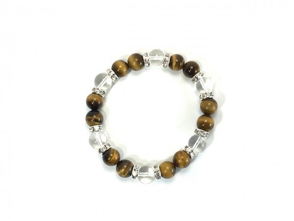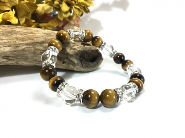 こちらは、タイガーアイと水晶を組み合わせたブレスレットです。間にはロンデルを挟み高級感あるデザインに仕上がっています。石大きさは腕にも馴染みやすいように10mm玉で内径約18cm(伸可能)です。数に限りがございますので気になる方はお早めにどうぞ。サイズ調節も可能ですのでサイズ調節の場合は取引ナビにてご一報くださいませ。(サイズ調節無料です)