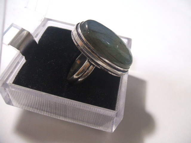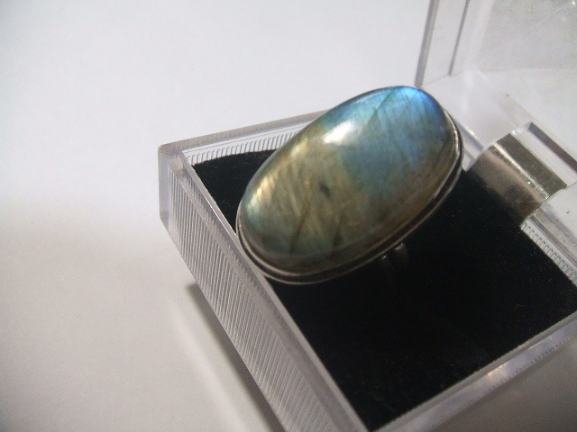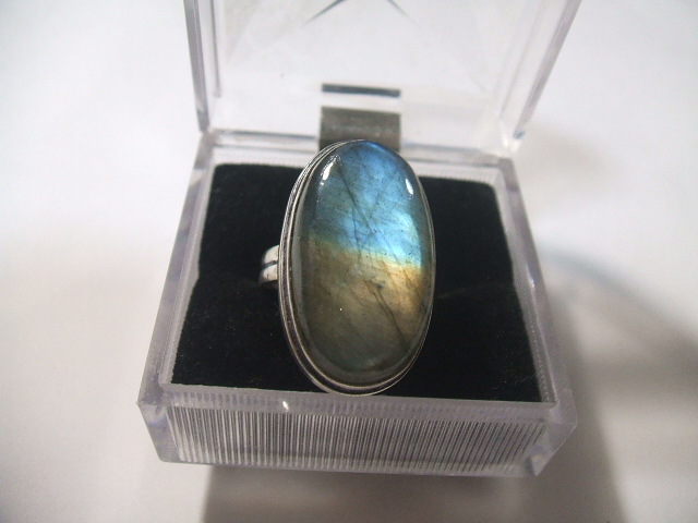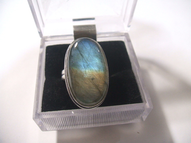 ブルーとオレンジ系の発光が2色に分かれて光るツートーンカラーのラブラドライトリングです。石の大きさは2.4x1.5センチ。金属はシルバーで925の刻印があります。