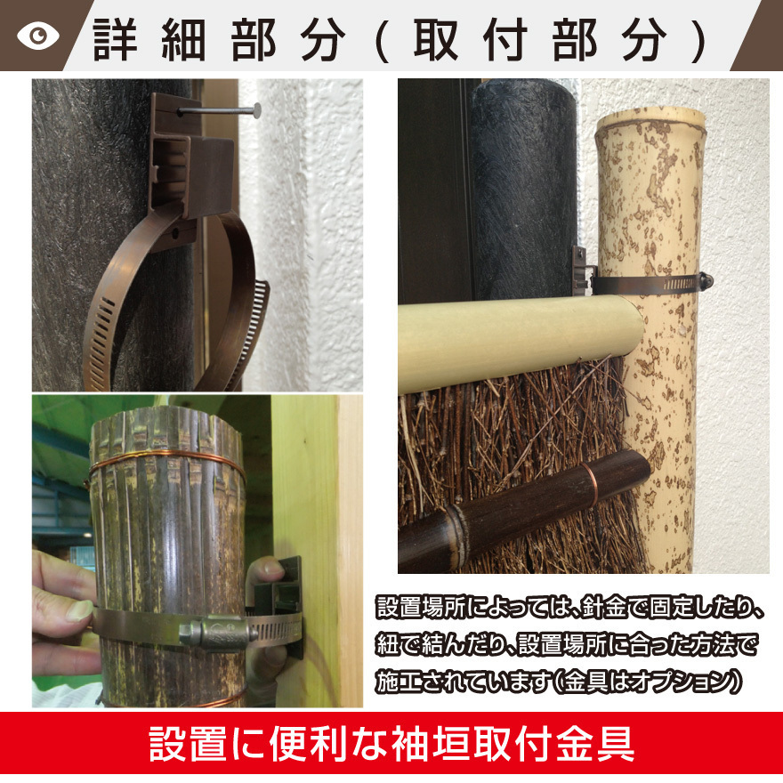 | 商品詳細 | この度は数ある商品の中から当商品を閲覧頂きまして有難う御座います。 商品定価 96,360円 ⇒ 販売価格 55,000円(送料・税込み) 「白玉袖垣(孟宗竹枝)」は、黒枝に比べてより細かい枝の孟宗竹枝を使用しており、 より繊細な竹の風情をお楽しみ頂けます。 お住まいの玄関脇の目隠しはもちろん、旅館、寺社仏閣事務所等で室外機の目隠しにも お使い頂いております。 商品名:白玉袖垣(孟宗竹枝) サイズ:幅 540mm×高さ 1650mm 材質:国産天然竹 他サイズ(W600XH1700、W700XH1750、W750XH1750、W900XH1750)や 特注サイズもご注文可能です。お気軽に質問欄よりお問い合わせ下さい。 取り付け方は建物や柱に針金などで固定して頂くだけで可能です。 オプションで取り付けに便利な袖垣固定金具も御座います。 |