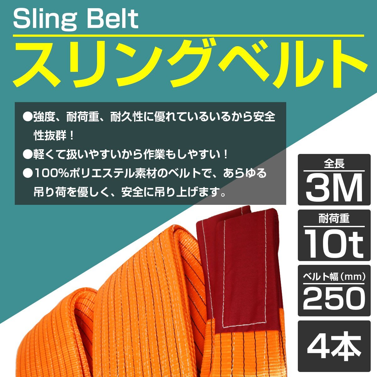 [4本 セット/耐荷10t/長さ 3m] スリング ベルト 吊上げ ナイロン クレーン ロープ 荷吊り 玉掛け 牽引 運搬 10トン 幅250mm
