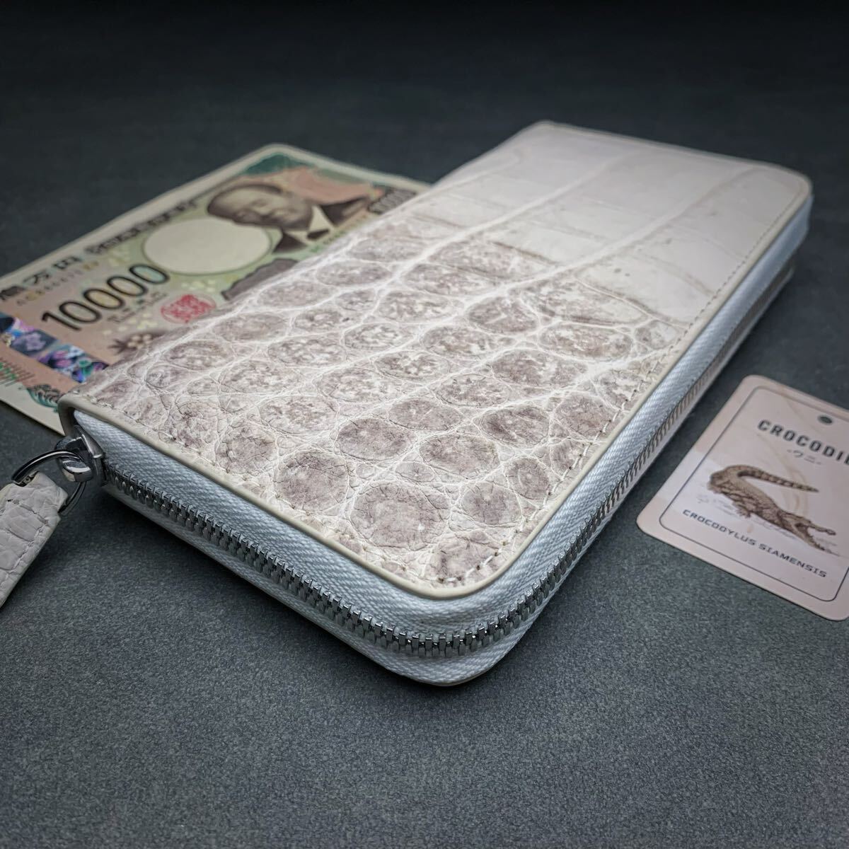 クロコダイルと呼ばれている品種のワニ革は人気が高く、独特の模様と凹凸が魅力で、高級ブランド品を中心にクロコダイルが多く使われています。今回はワニ革の代表格である<シャムクロコダイル>の背革部のラウンドファスナー財布を出品します。