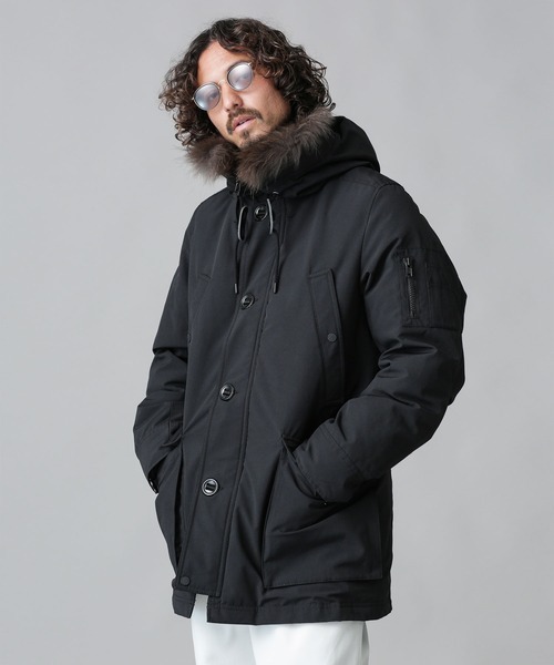 素材:表生地、ポリエステル82%, 綿18%、裏生地: ポリエステル100%、身頃部分、中わた: ダウン90%, フェザー10% フード、袖部分、中わた: ポリエステル100%、リブ部分: アクリル90%, ポリエステル7%, ポリウレタン3%、ファー部分: チャイニーズラクーン、皮革部分、牛革