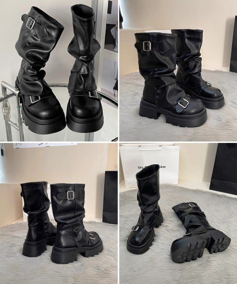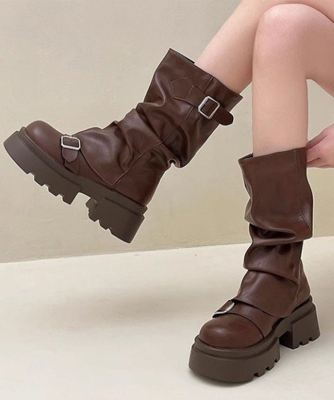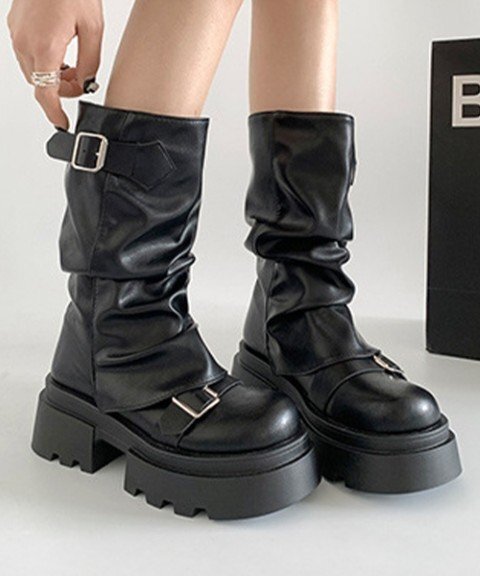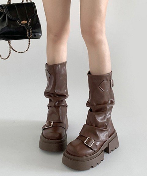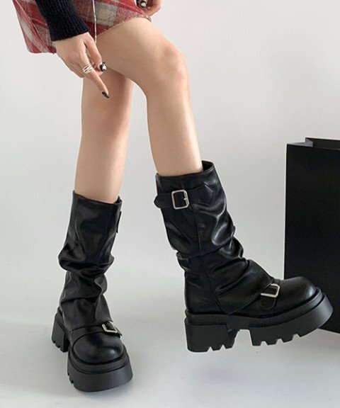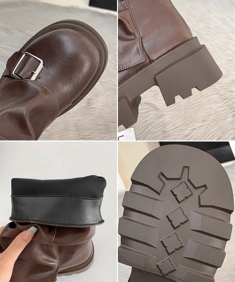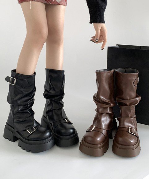ルーズな履き口デザインがカジュアルでありながら、こなれ感のある印象を演出するベルト付き厚底カバーブーツ。