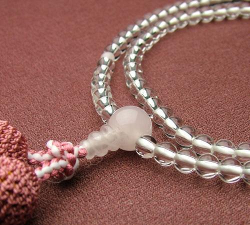 ・親珠、四天珠がローズクウォーツ、主珠が水晶で、全体的にやさしく清楚な雰囲気があります。