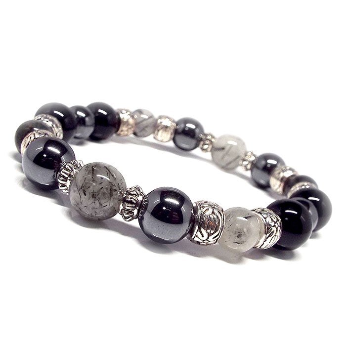 【STONE KITCHEN 天然石 パワーストーン】 ☆勉強運、仕事運、幸運・運気アップの魔よけ・厄除け・お守りブレスレット☆ ブラックルチルクォーツは直感力を高めるストーン!!! 人脈や仕事運に効果があります。 さらにブラックオニキスやヘマタイトを合わせて 悪運から身を守ってくれます♪ シンプルなデザインなので、時計やミサンガなど 重ねづけでの相性も抜群です♪ 誕生日やバレンタイン、クリスマス、父の日など 記念日のプレゼントやギフトにもおすすめです!! 内周:約17cm サイズ:ブラックルチルクォーツ 10mm・8mm ヘマタイト 10mm・8mm オニキス 10mm 1点 注意事項 ※金属部分は汗や汚れ等で変色する場合がございます。気になる場合は 金属磨きや布等で軽くふき取る事をおすすめします。 ※石の種類によっては、艶を引き出すことを目的として、ワックスや着色加工がされているものもあります。 ※表示のサイズは必ずしも最大値・最小値のサイズのものが入っているわけではございません。 ※天然石のため同じものでも色味・模様などが異なります。 ※照明の具合で実際とは色合いが異なる場合がございます。 また、天然素材特有のクラック・内包物を有する場合がございます。予めご了承下さい。 | |||