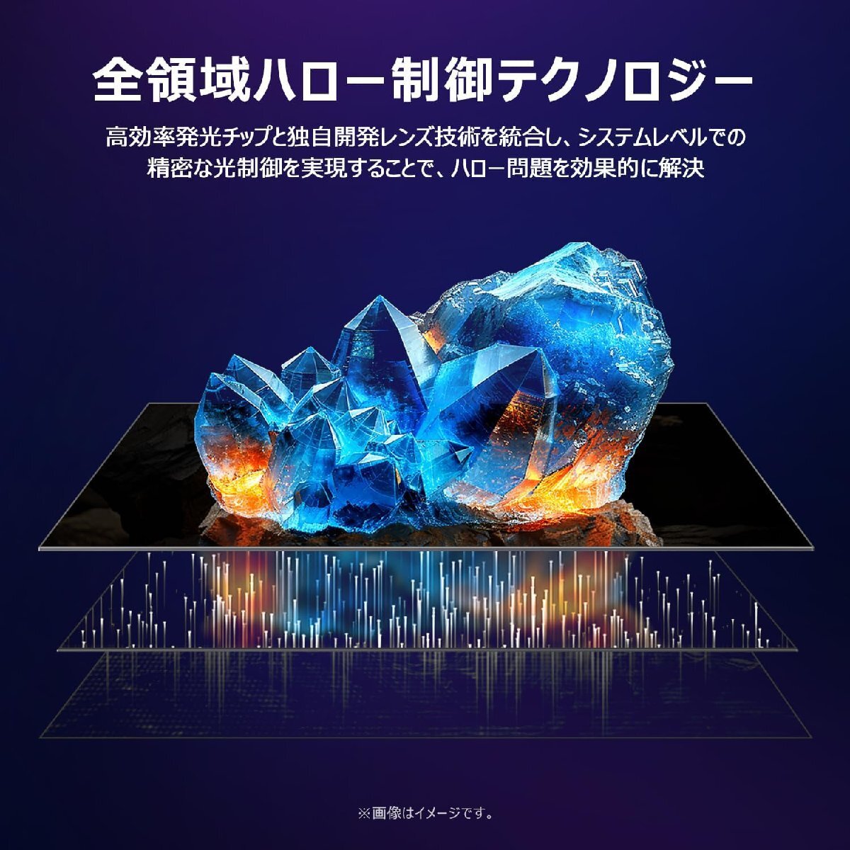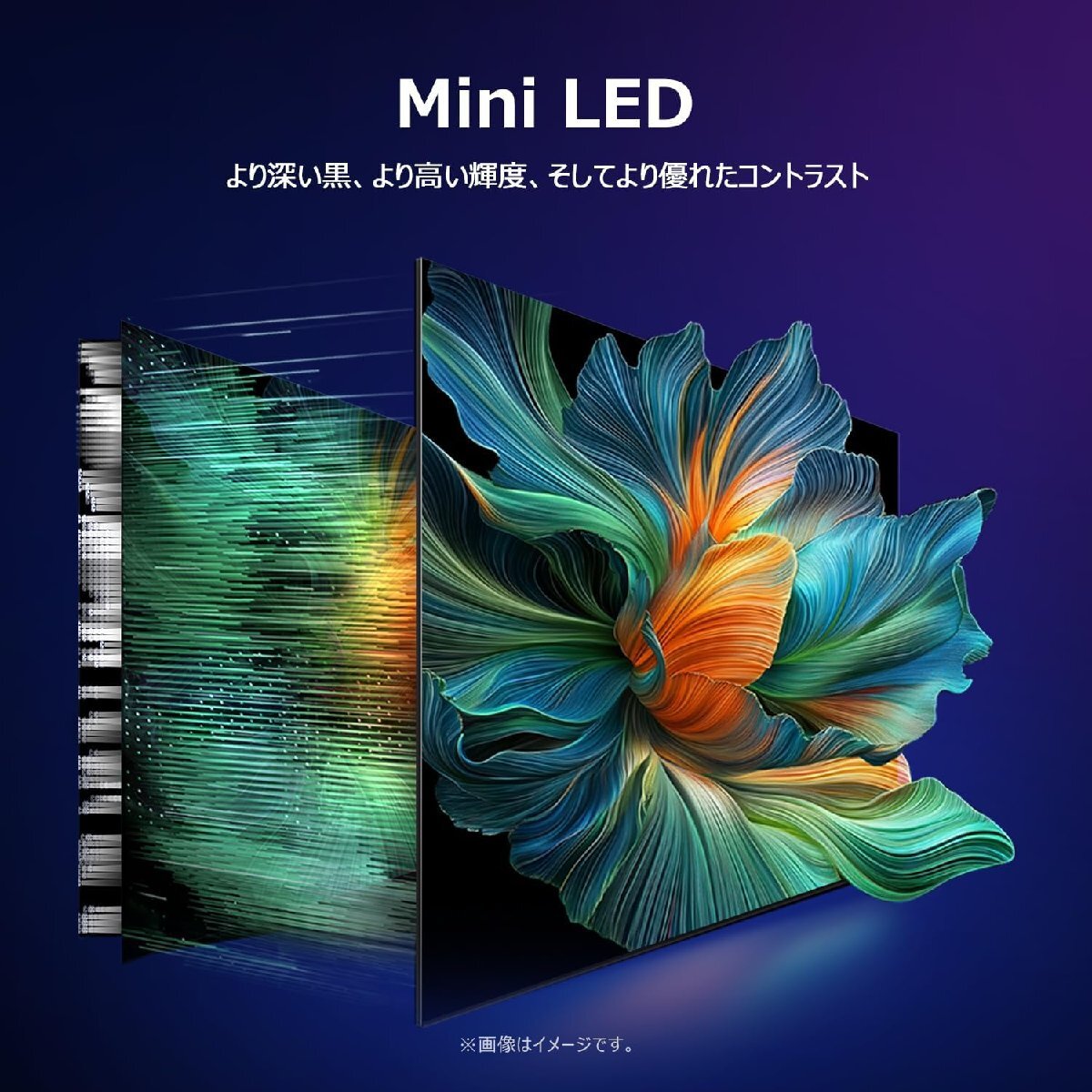 Mini LED×全域ハローコントロール技術で極上画質 :Mini LEDバックライトにより、1000nitの高輝度と5倍のコントラスト強化を実現。さらに全域ハローコントロール技術で光のにじみを抑え、クリアな明暗表現に。AiPQ Pro プロセッサーが色彩・明暗・動きを自動で最適化し、シーンごとに美しい映像を描き出します。