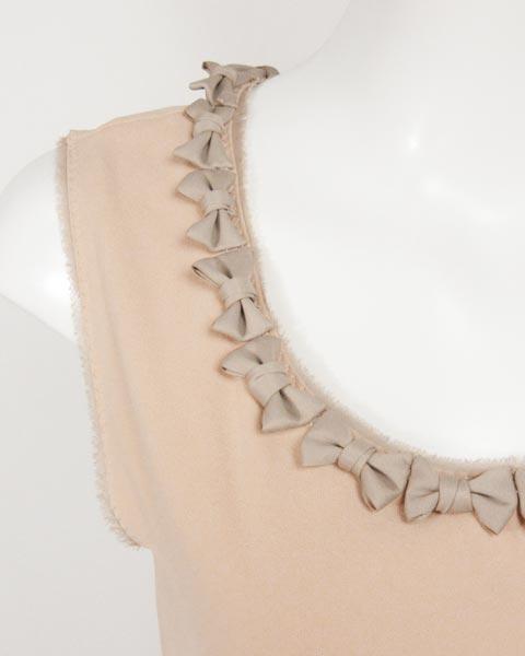 大人かわいいキャンディワンピース。首元にあしらわれたリボンがアクセントになります。ヌーディーなピンクベージュがとっても上品ですよ。プルオーバータイプのミニワンピースなので、着心地も抜群です。 |