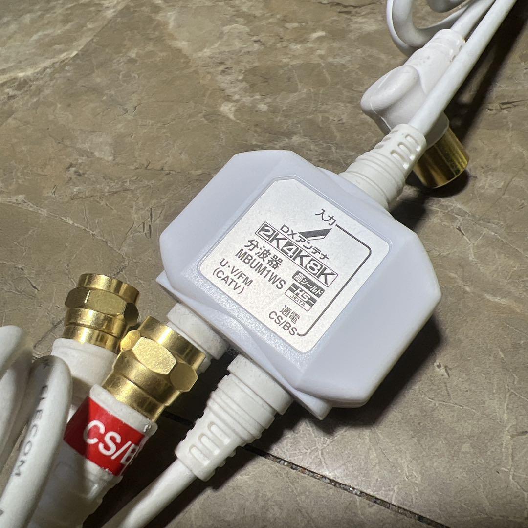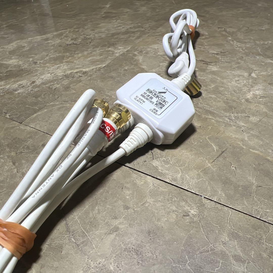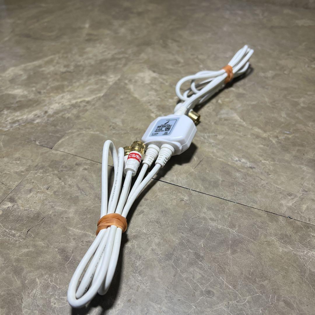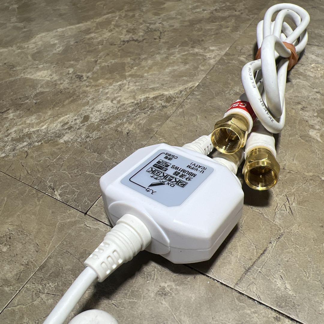 ・出力側ケーブル付全端子通電形2分配器。テレビの電波を2つに分けます。