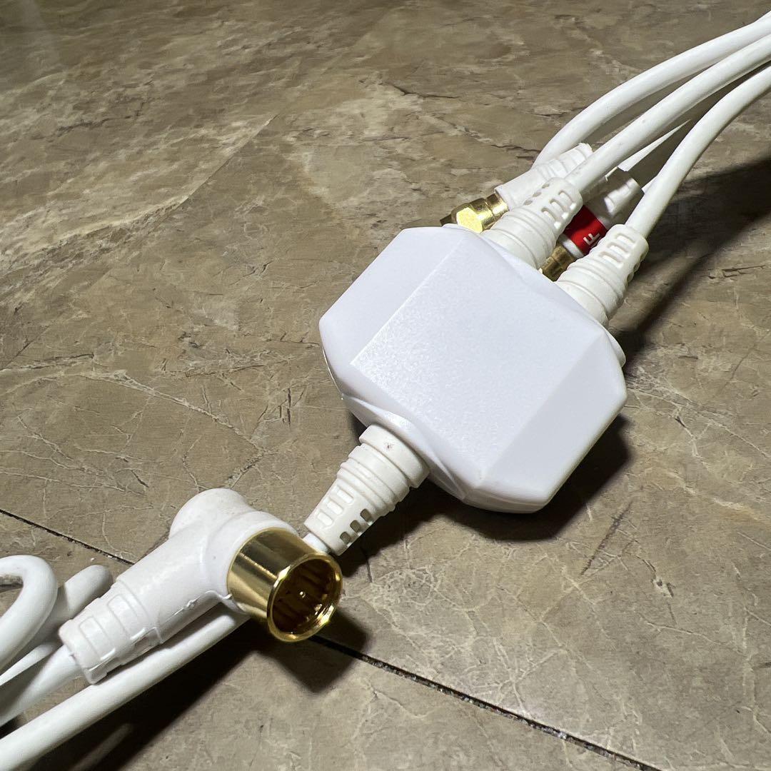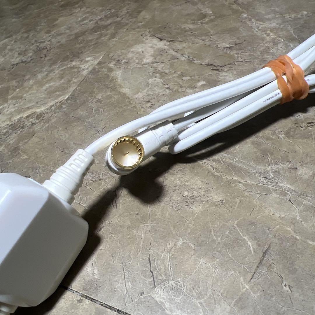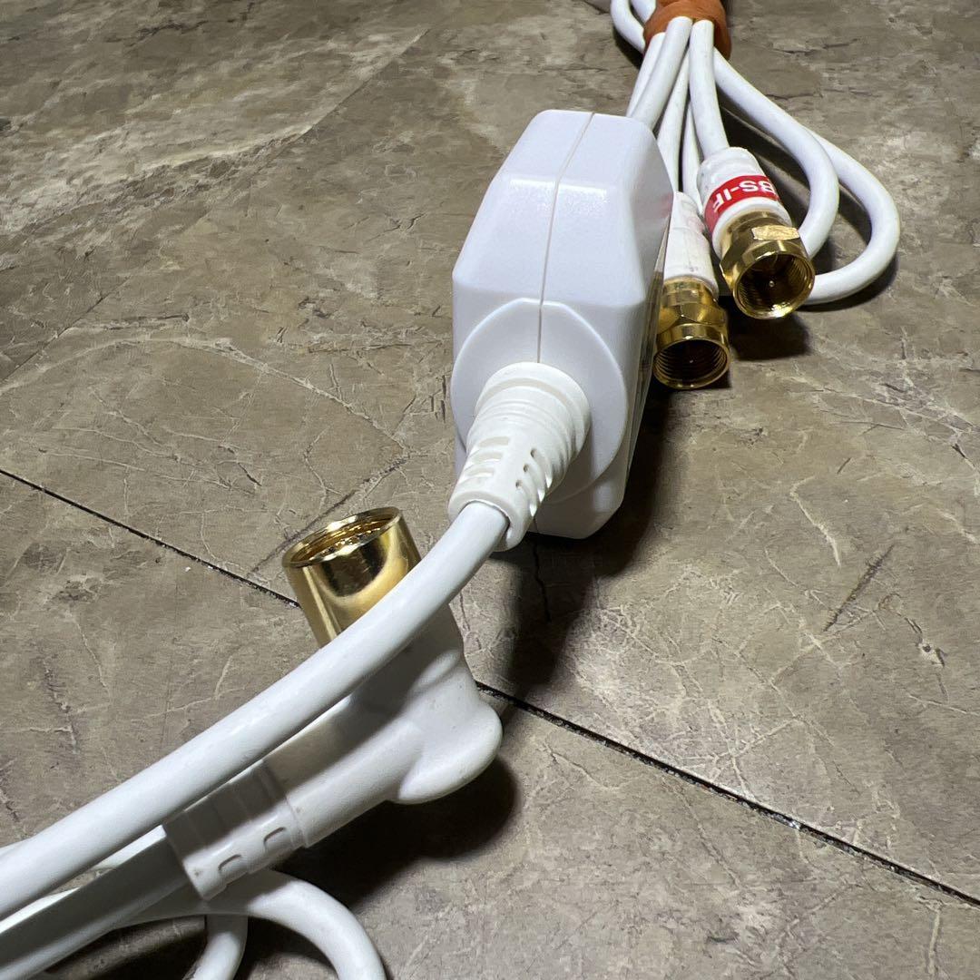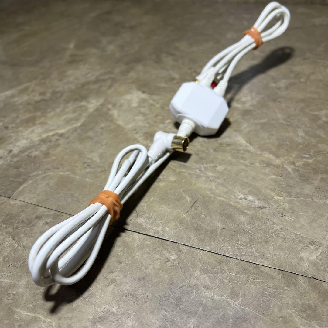 ・出力側ケーブル付全端子通電形2分配器。テレビの電波を2つに分けます。