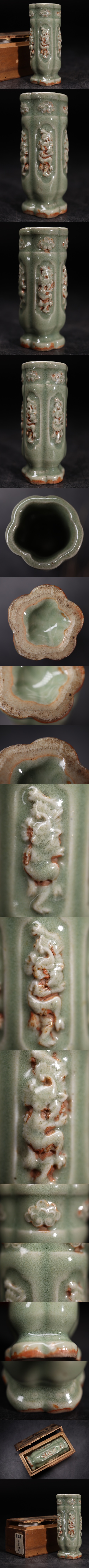 時代 青磁 龍紋 陽刻 巾筒 木箱付 / 中国美術 茶器 筒 煎茶道具 検索: 龍泉窯 天龍寺 .G2800 |