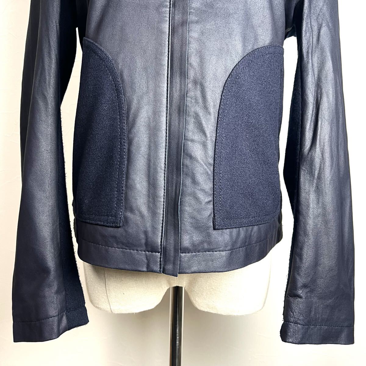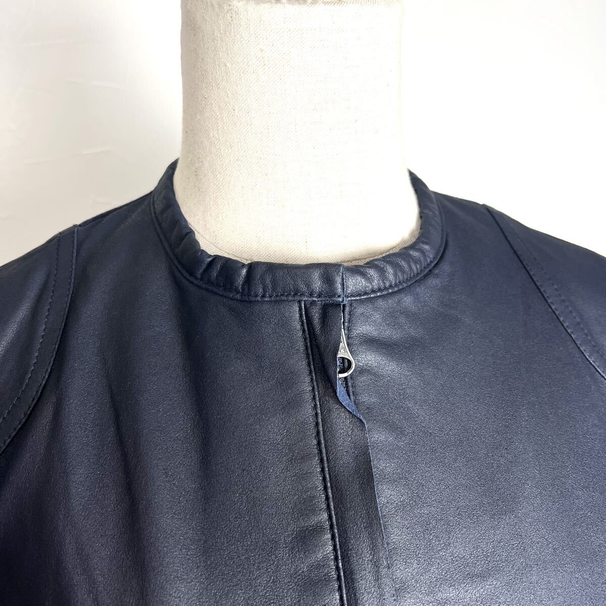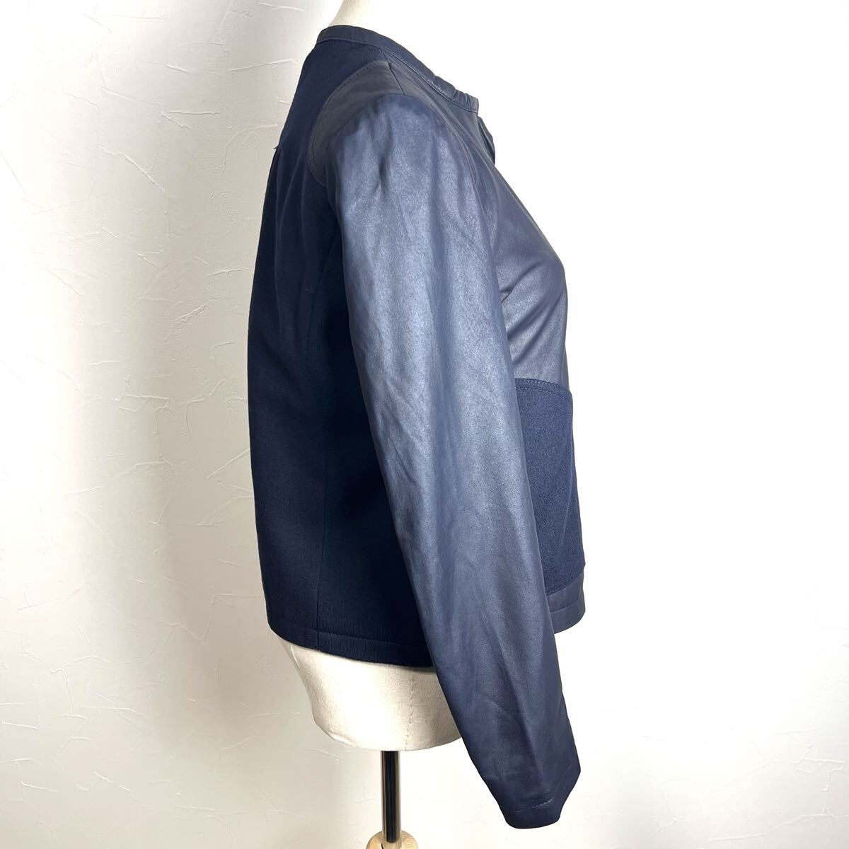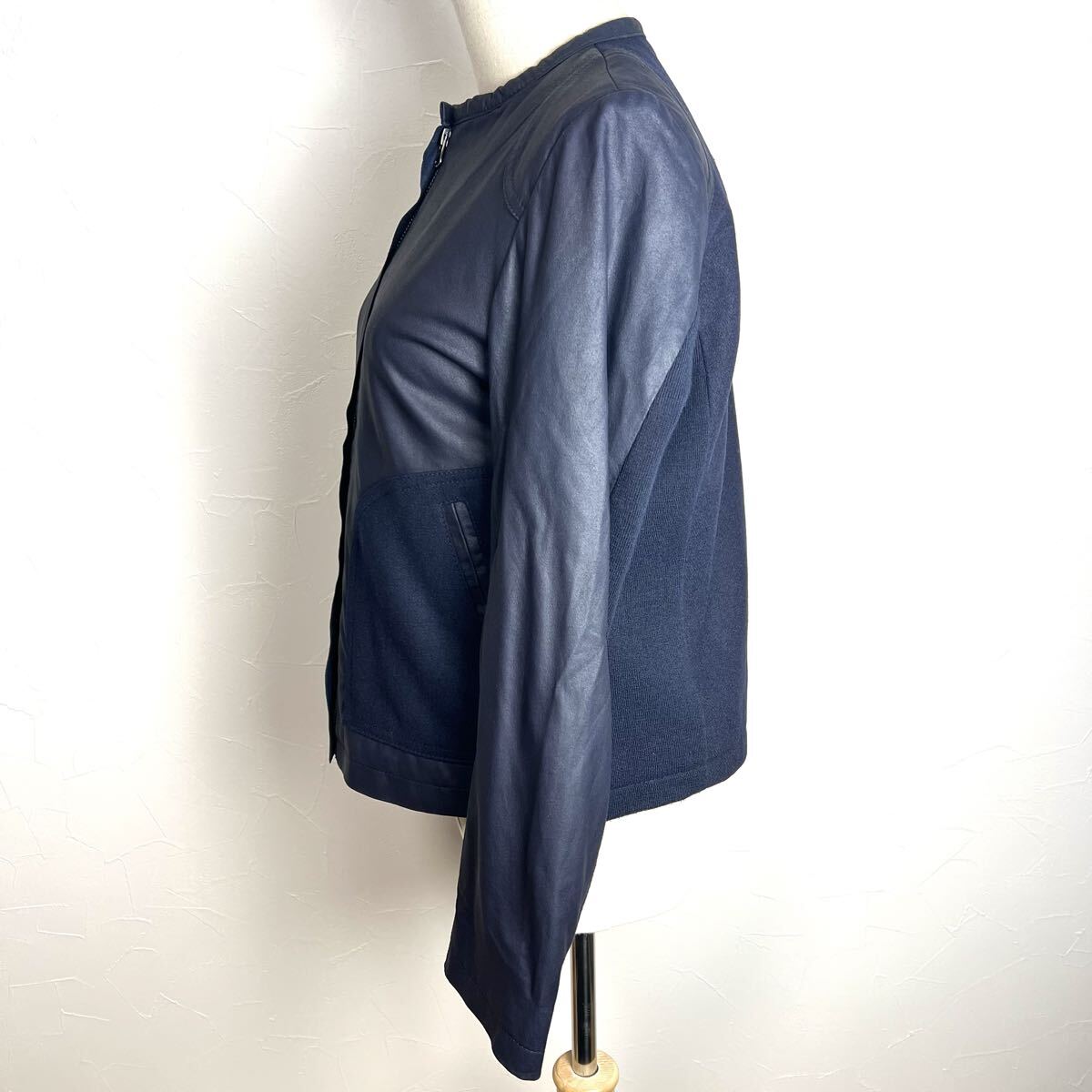 上質なラムレザーと濃紺の異素材を切り替えたデザイン性の高い一着です。すっきりとしたノーカラーで上品に着こなせ、カジュアルにもきれいめにも合わせやすいアイテムです。