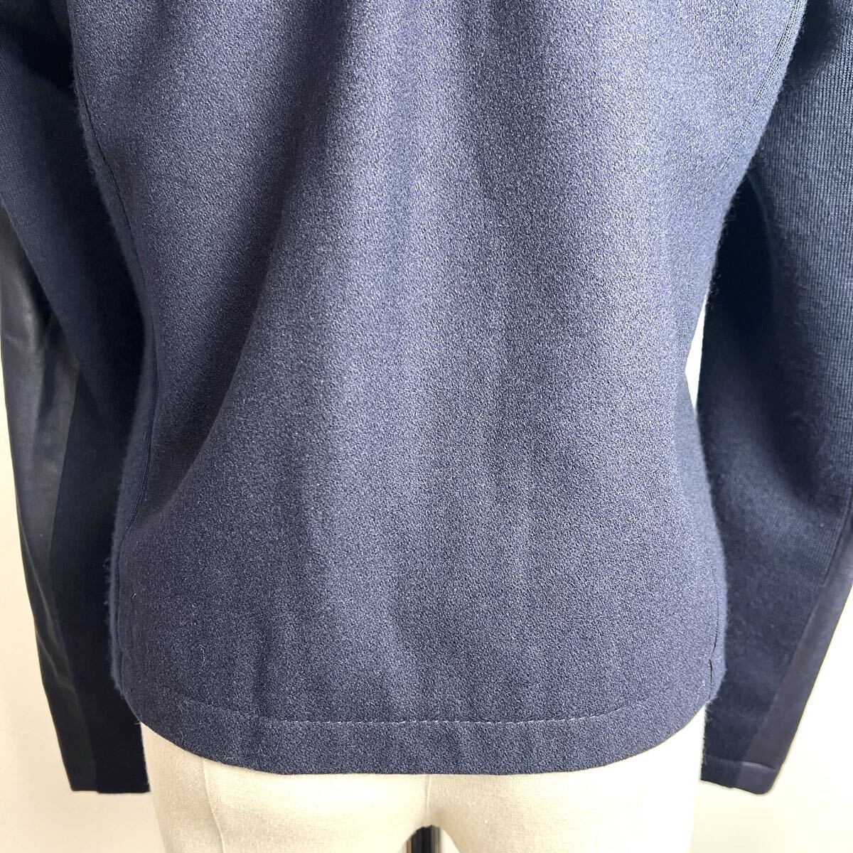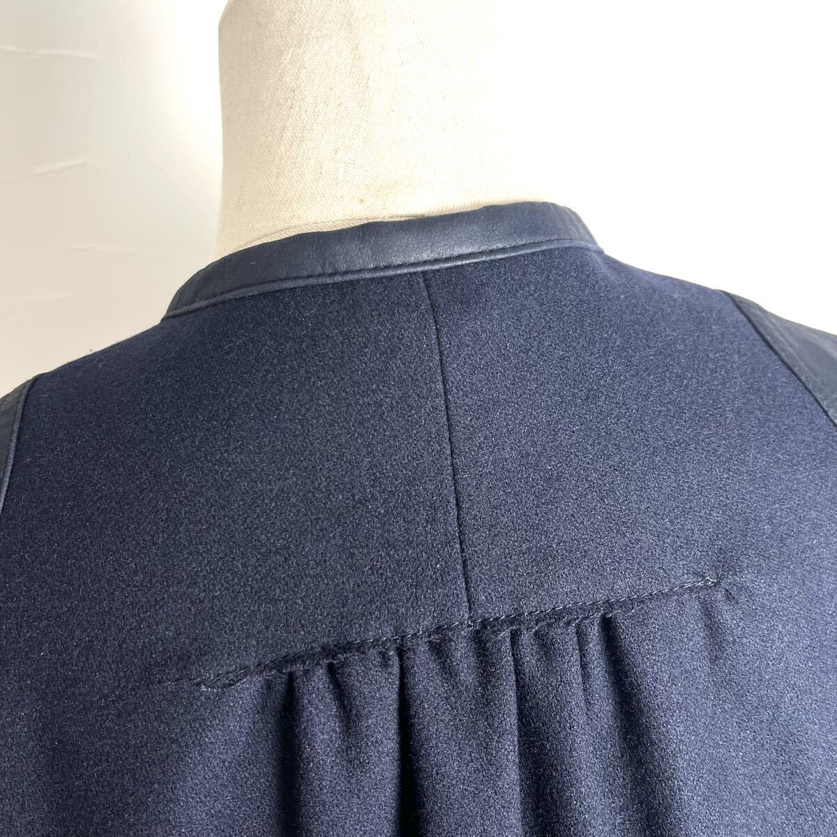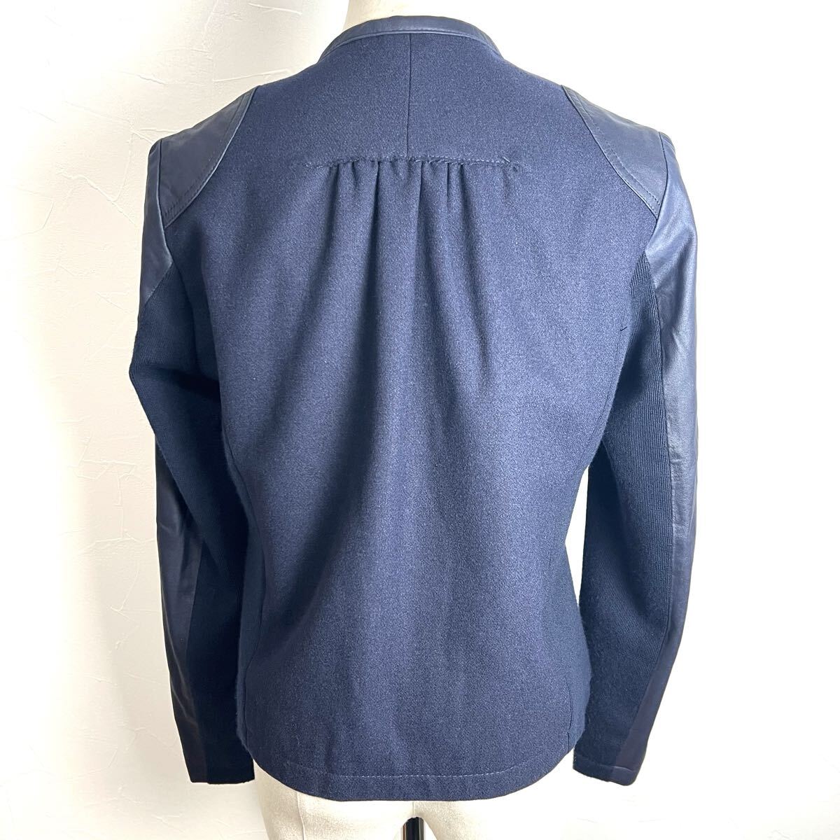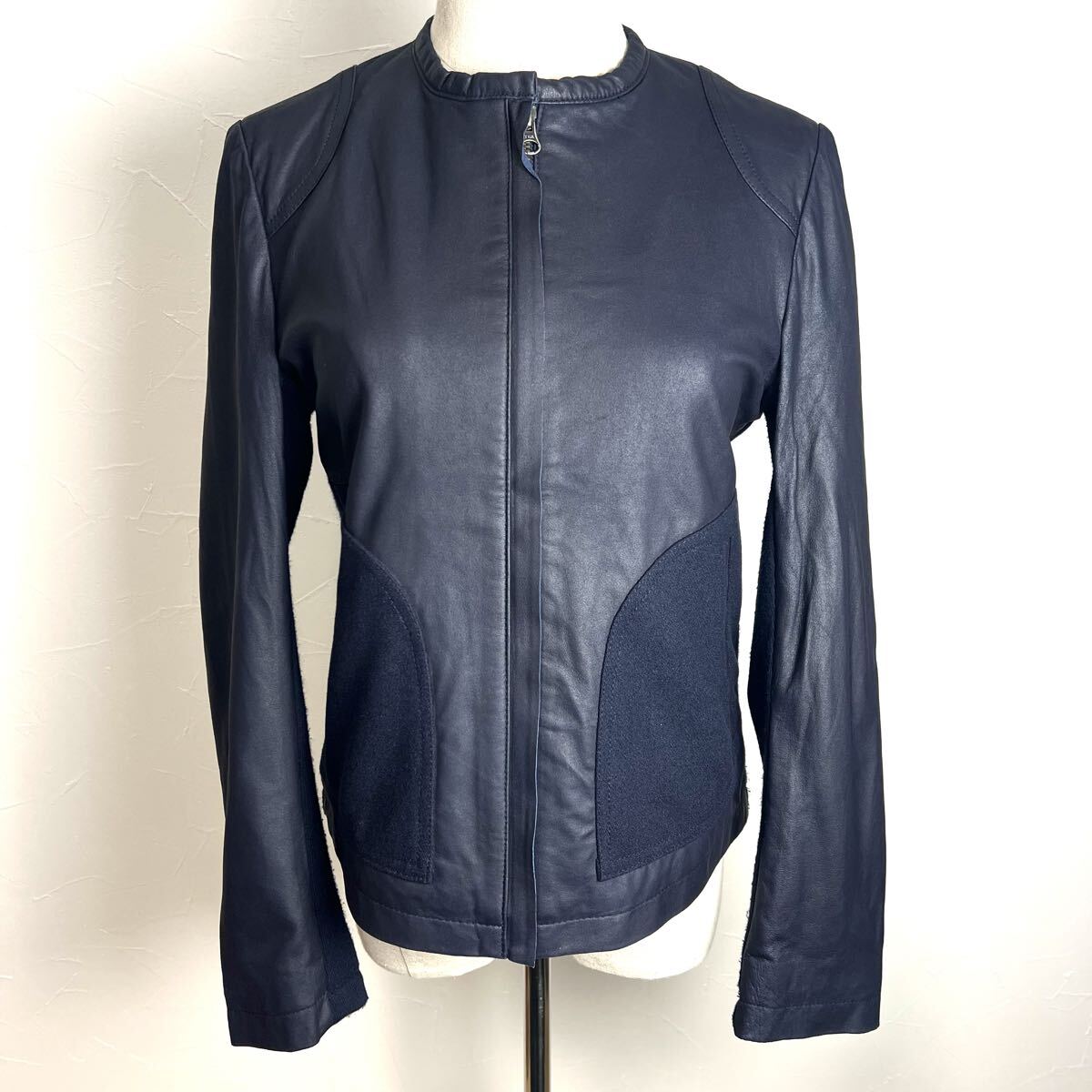 上質なラムレザーと濃紺の異素材を切り替えたデザイン性の高い一着です。すっきりとしたノーカラーで上品に着こなせ、カジュアルにもきれいめにも合わせやすいアイテムです。