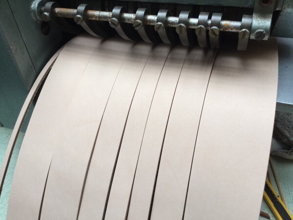 成牛(北米産ステア)のフルタンニンなめしの革をベルト裁断機でカットしたものです。