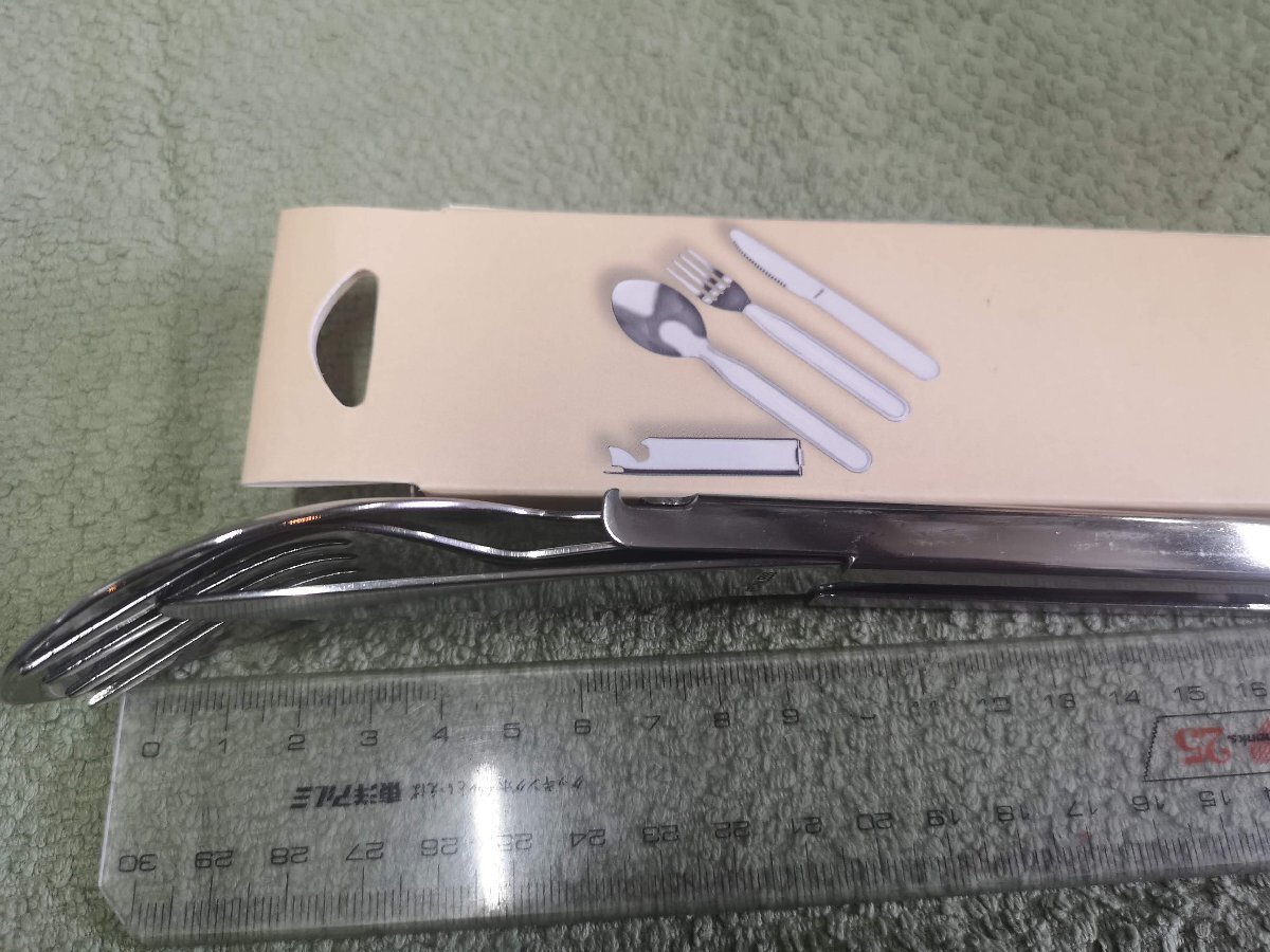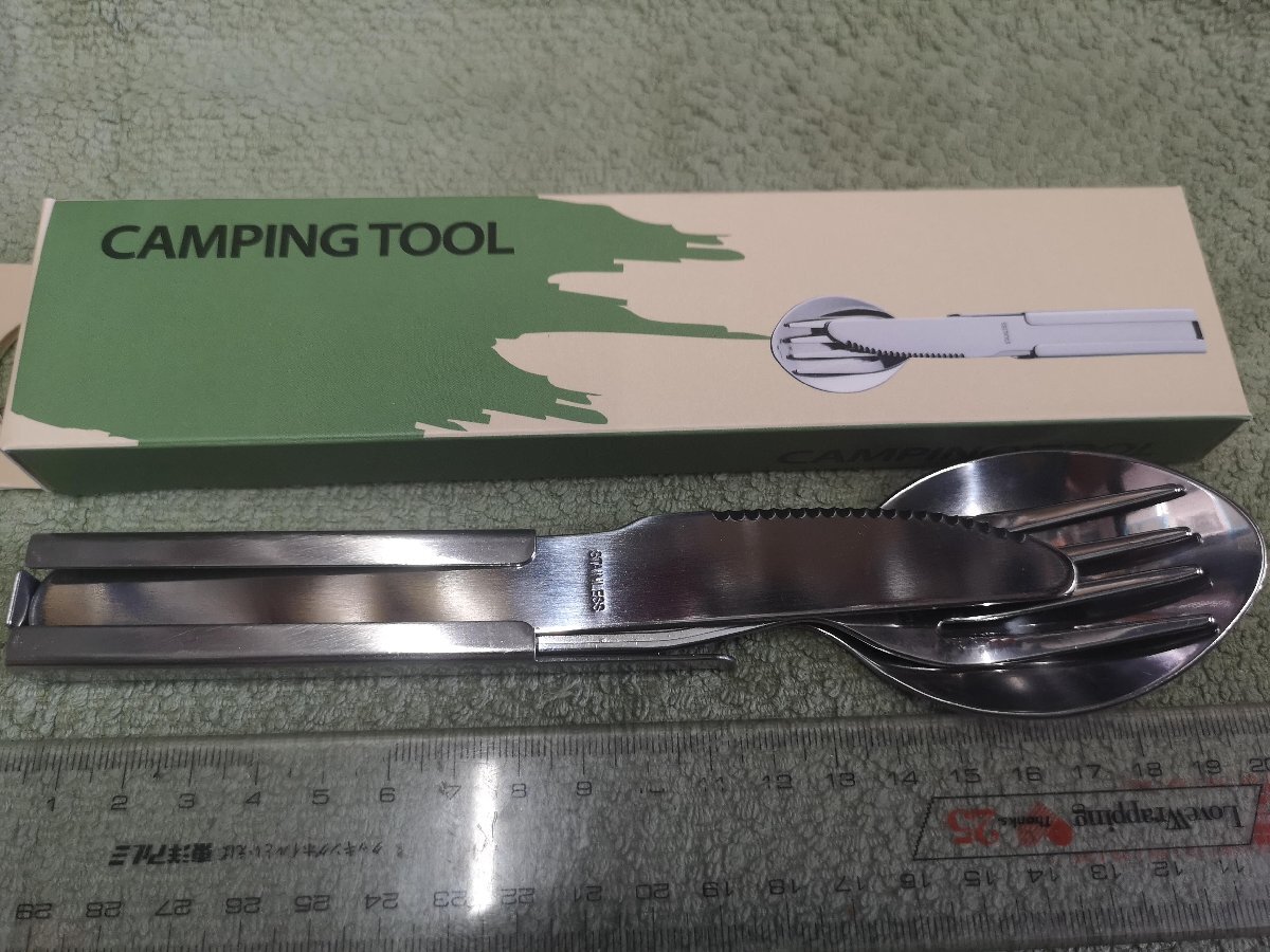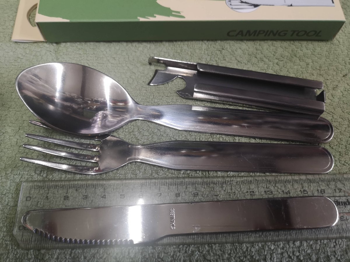 収納したときの寸法は18.9cmほど厚みは2cm程度です、重量は150グラム程度。おそらくはドイツ軍のカトラリーセットが元ネタです。クオリティーは本物と同程度(あくまで主観)で値段は半分な感じです。 スプーン・フォーク・ナイフ・栓抜き・缶切りの五徳です。 素材はステンレス。 クロネコネコポス便200円にて元払いいたします、落札価格にプラスでお願いします。その他アウトドアーグッズ