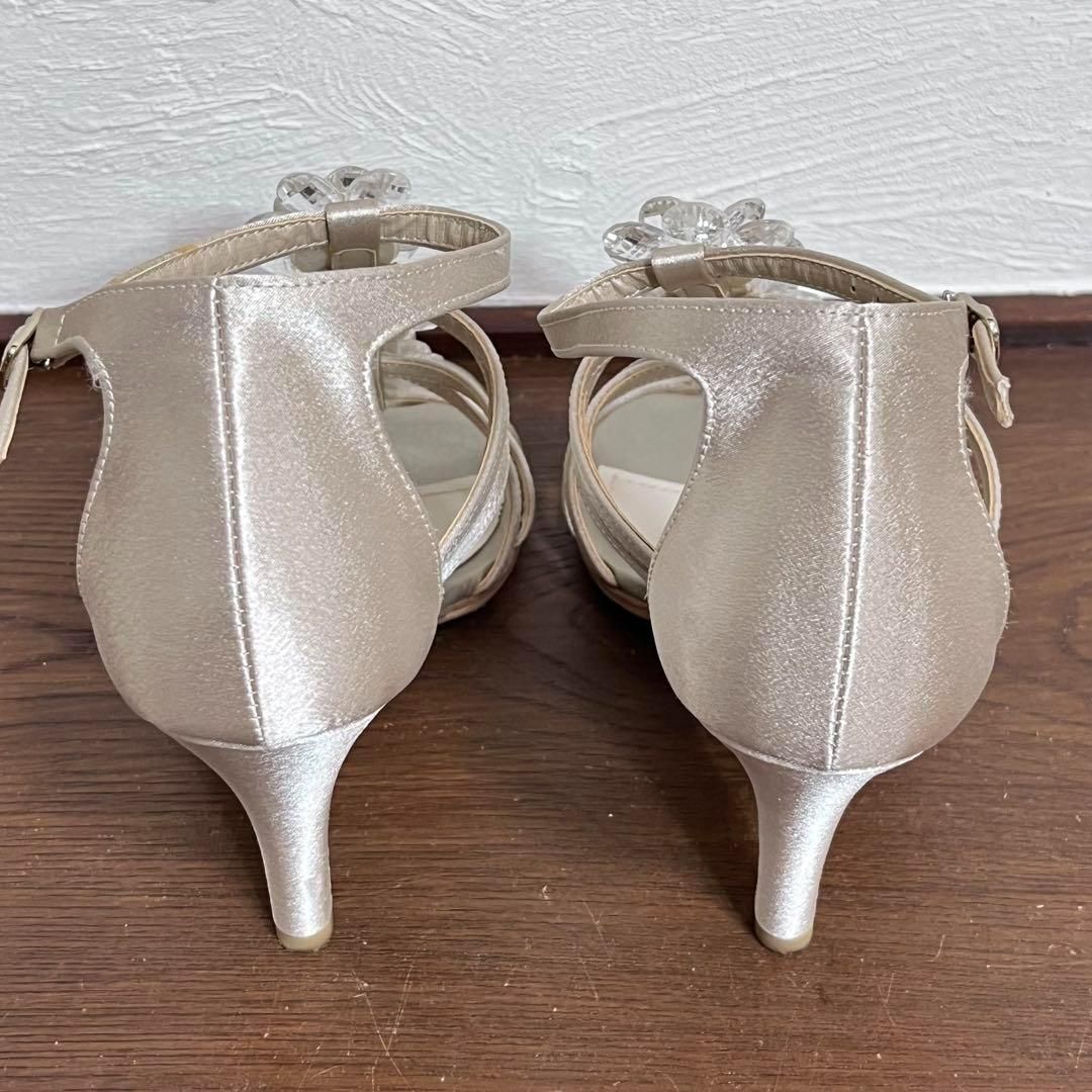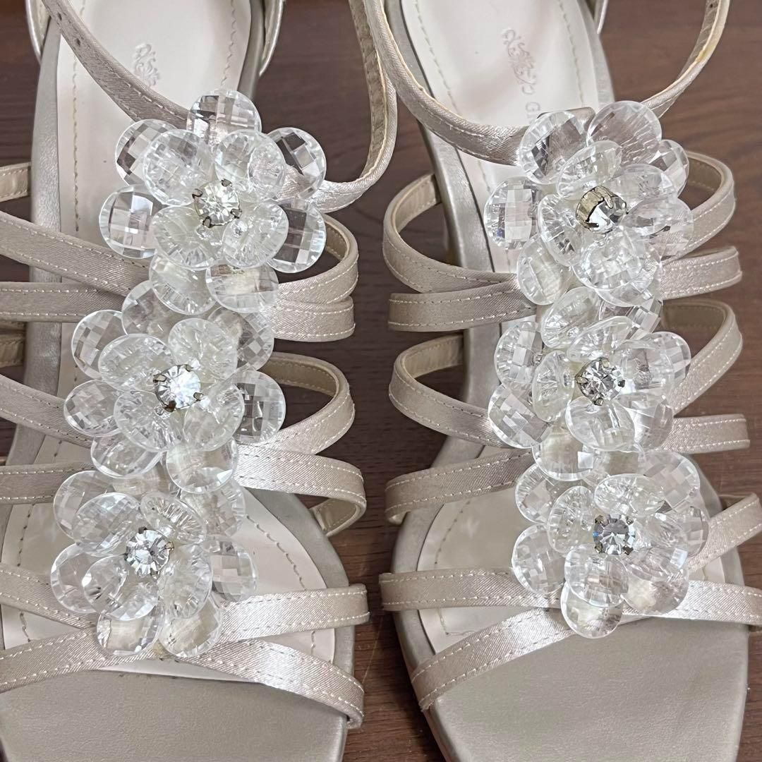 パーティーサンダル ビジュー フラワーモチーフ 結婚式 お呼ばれ ドレスサンダル ストラップサンダル シャンパンゴールド きれいめ 上品 フェミニン