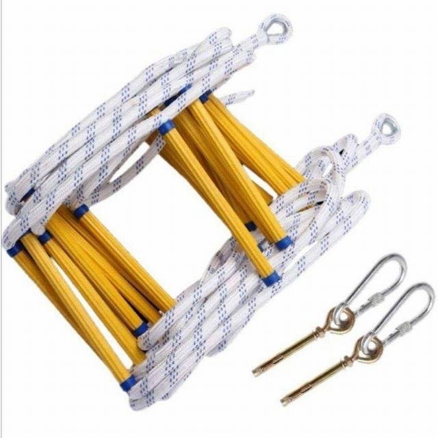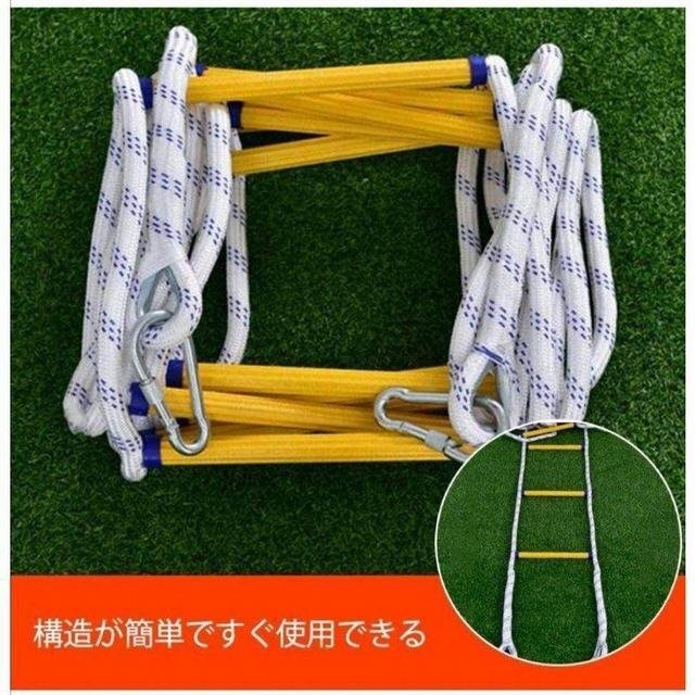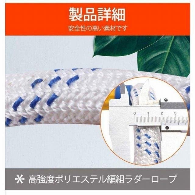 強いポリエステル素材を特殊に編み合わせたラダーロープなのでとても丈夫です。緊急時に3人同時にお使い頂けます。 【滑り止め樹脂付きの安全ステップポール】 滑り止め付きなので、急いで昇降する際も足に摩擦をもたらしてくれる為、登りやすくなっております。 【多重保護マンガン鋼フックリング】 厚みがあり摩耗性の強いマンガン鋼素材を、一番負荷のかかるループ内に取り付けております。"
