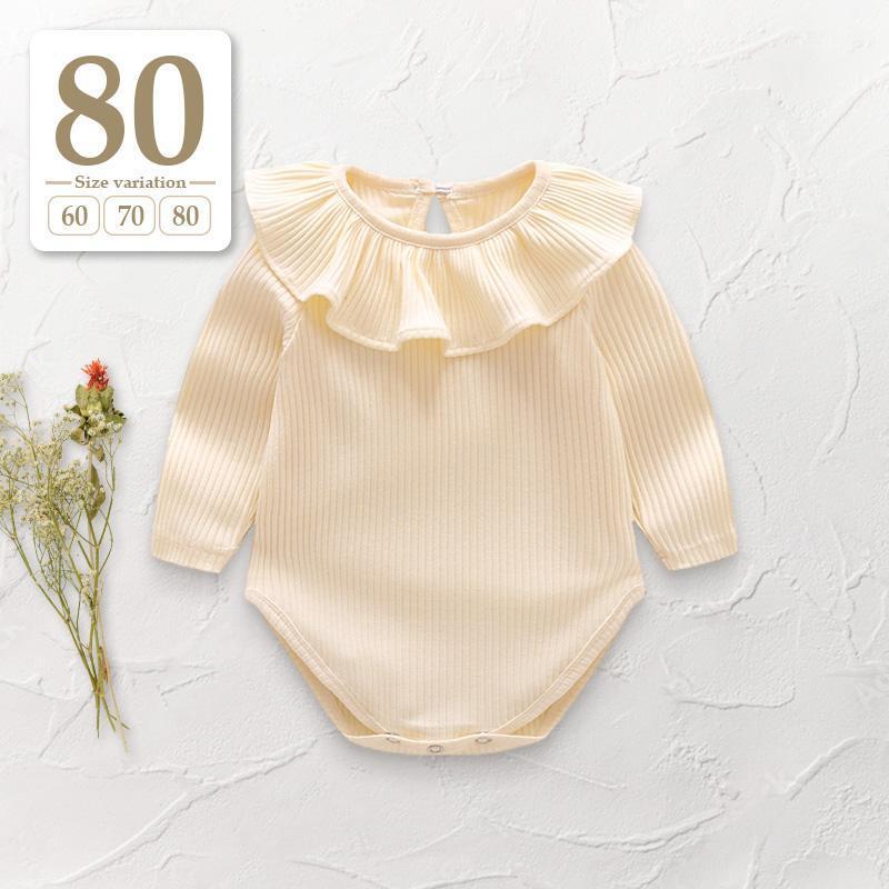 新品未使用 80cm アイボリーホワイト〔#BMラッフル長袖ロンパース〕フリル 襟付き 長袖 リブ ロンパース ベビー 子供 女の子 出産祝い 白
