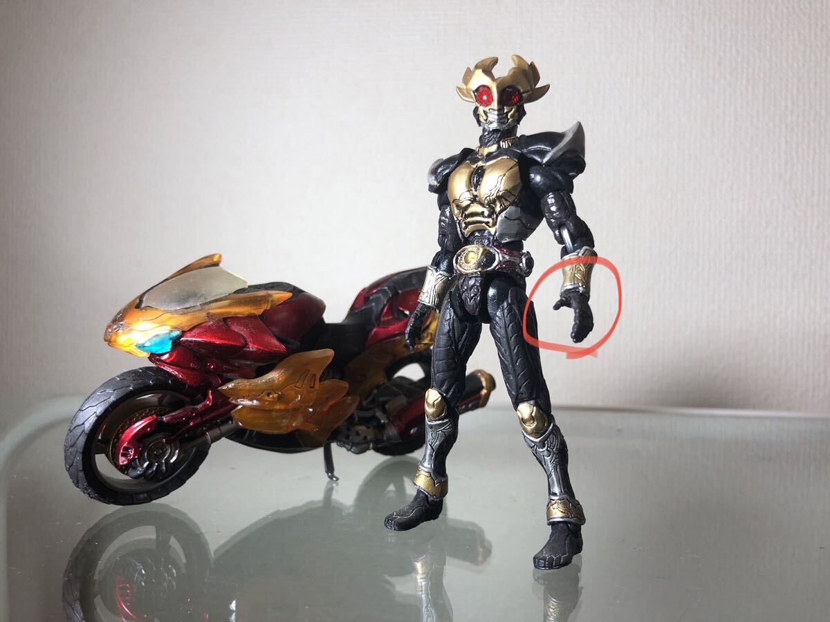 極魂は仮面ライダーアギト、マシントルネイダーです。9枚目の写真の丸で囲ってるとこですが、手首が折れてるため接着剤で止めてます。また、箱、説明書、その他付属品ついておらず、写真のものが全てです。