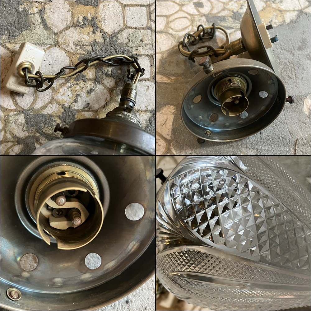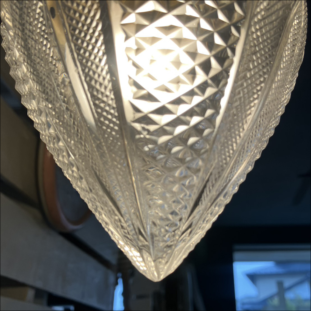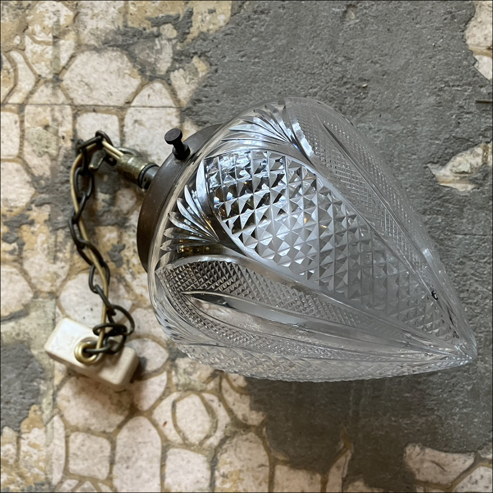カットガラスのシェードが特徴的なUKペンダントライトです。 USEDのためキズ/スレ/錆など使用感があり 先端に小さな欠けがあるなど傷みもありますのでご了承ください。 (※基本的に電球は付属しません。) ※動作確認をした上で使用に関しましては問題無いと思いますが ヴィンテージ、アンティーク商品などの為、使用に伴う事故や 故障に関しましては一切の責任は保証致しません事をご了承下さい。 【 Size(約):W12 H17 D12cm 】 ≪月・火以外の13:00~19:00で直接お渡しも可能です。≫(東京町田市)