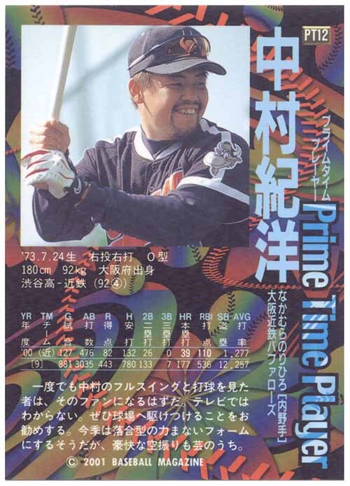即決! 2001 BBM プライムタイムプレイヤー 中村 紀洋 PT12 挿入カード