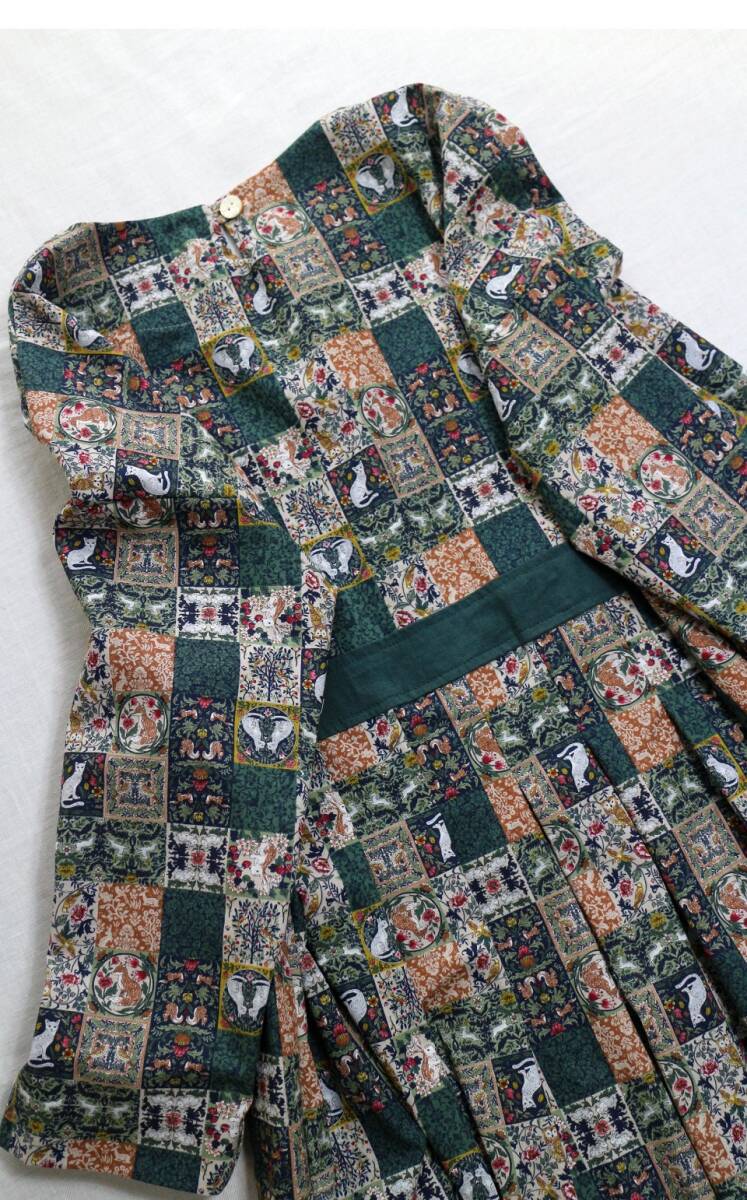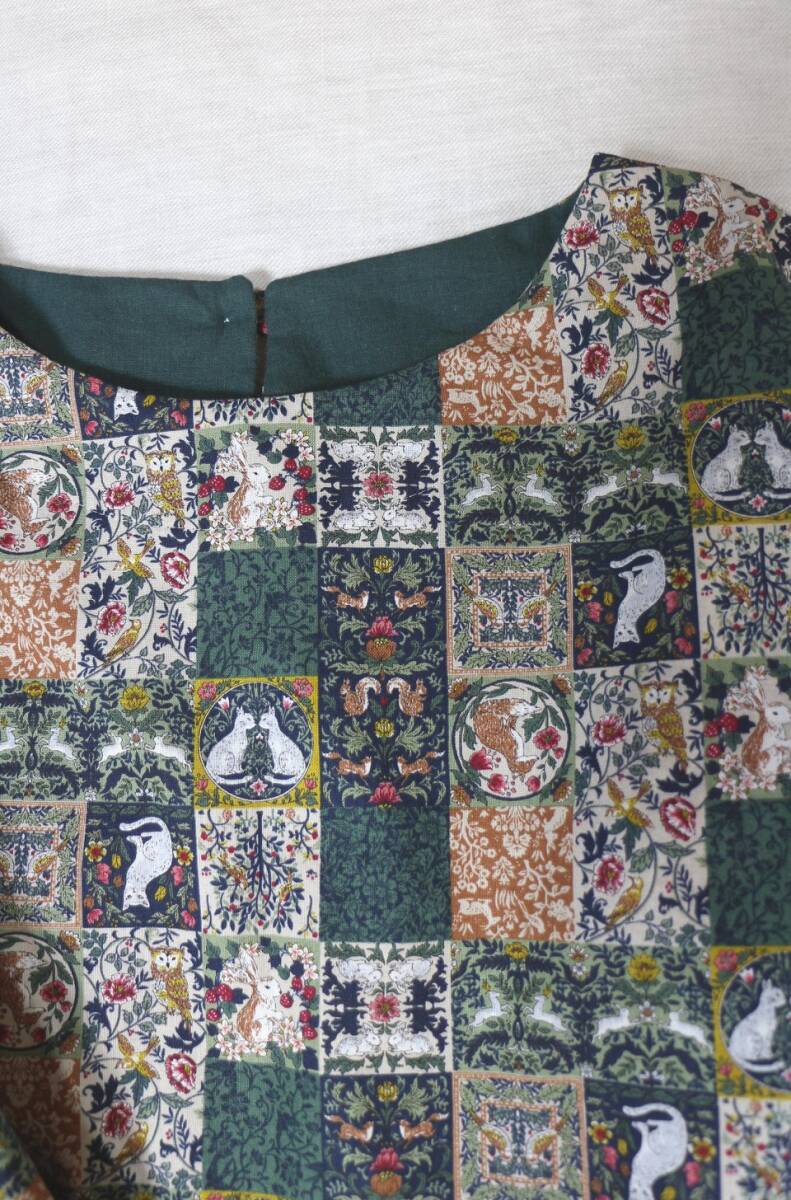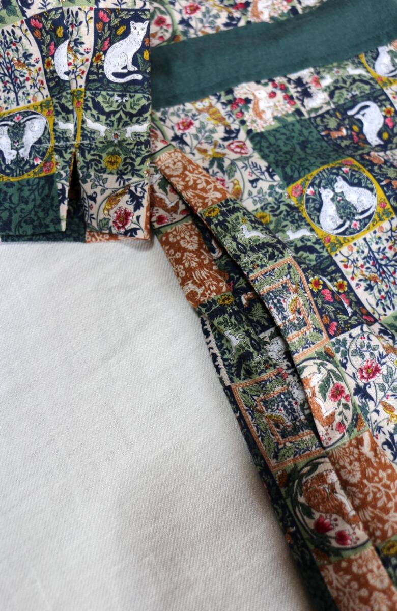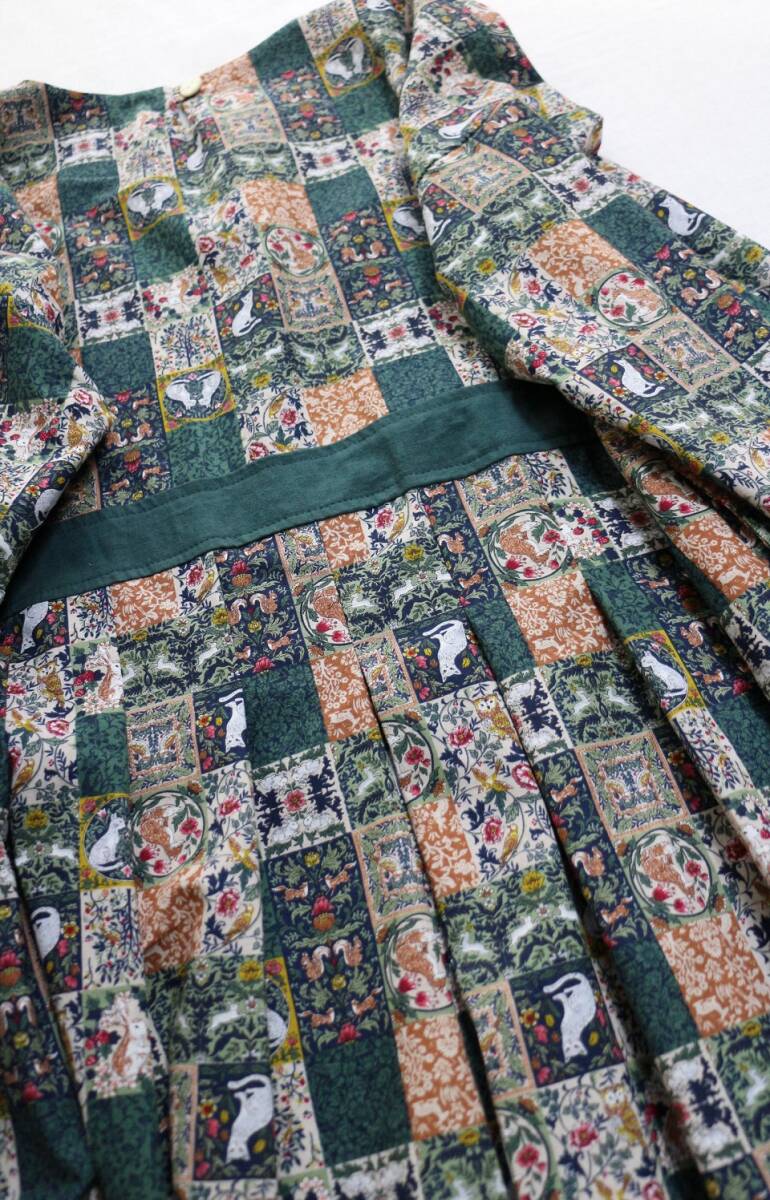 身頃切り替え下にダークグリーンのリネンのマチを挟み切り替え下はタックスカートになります